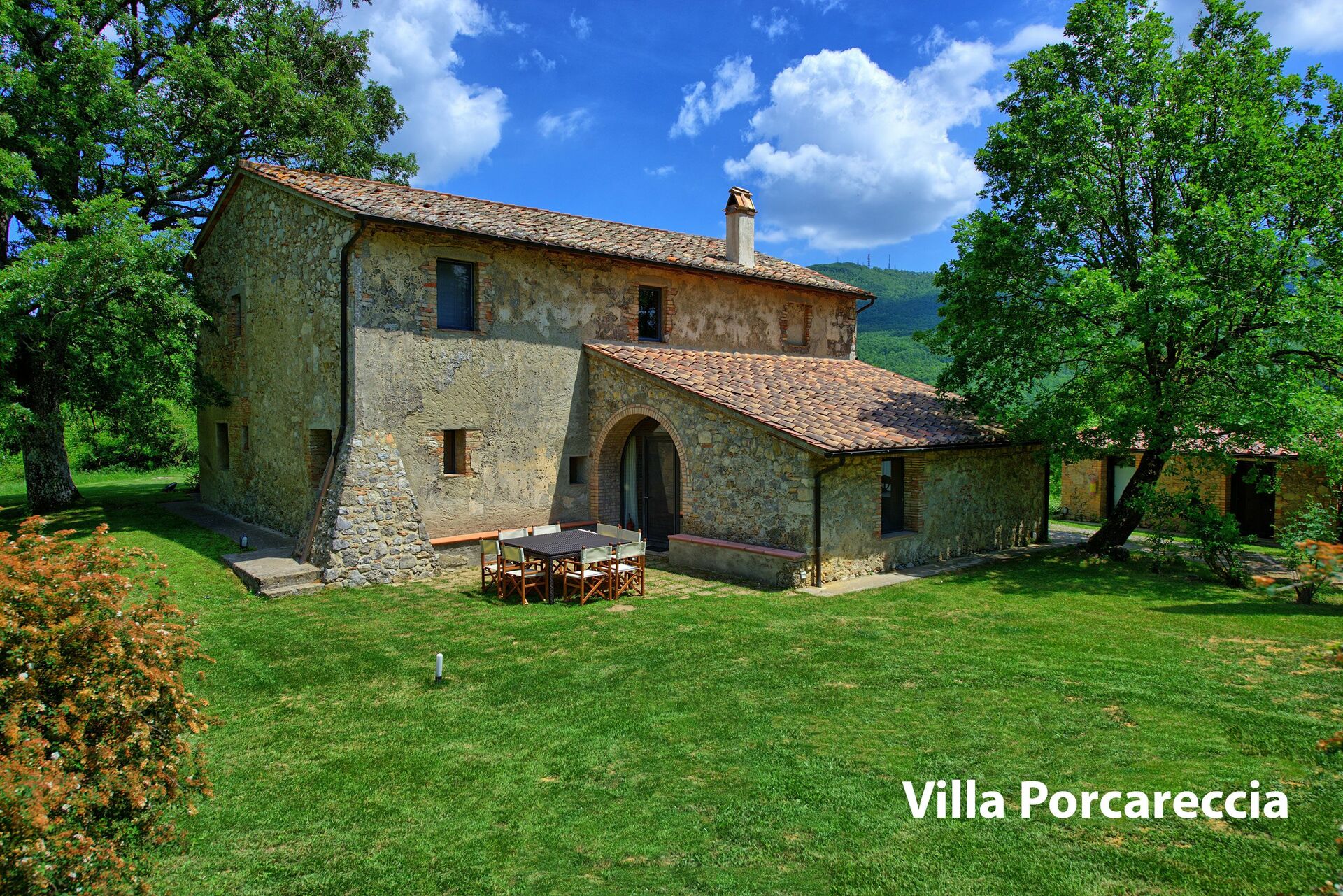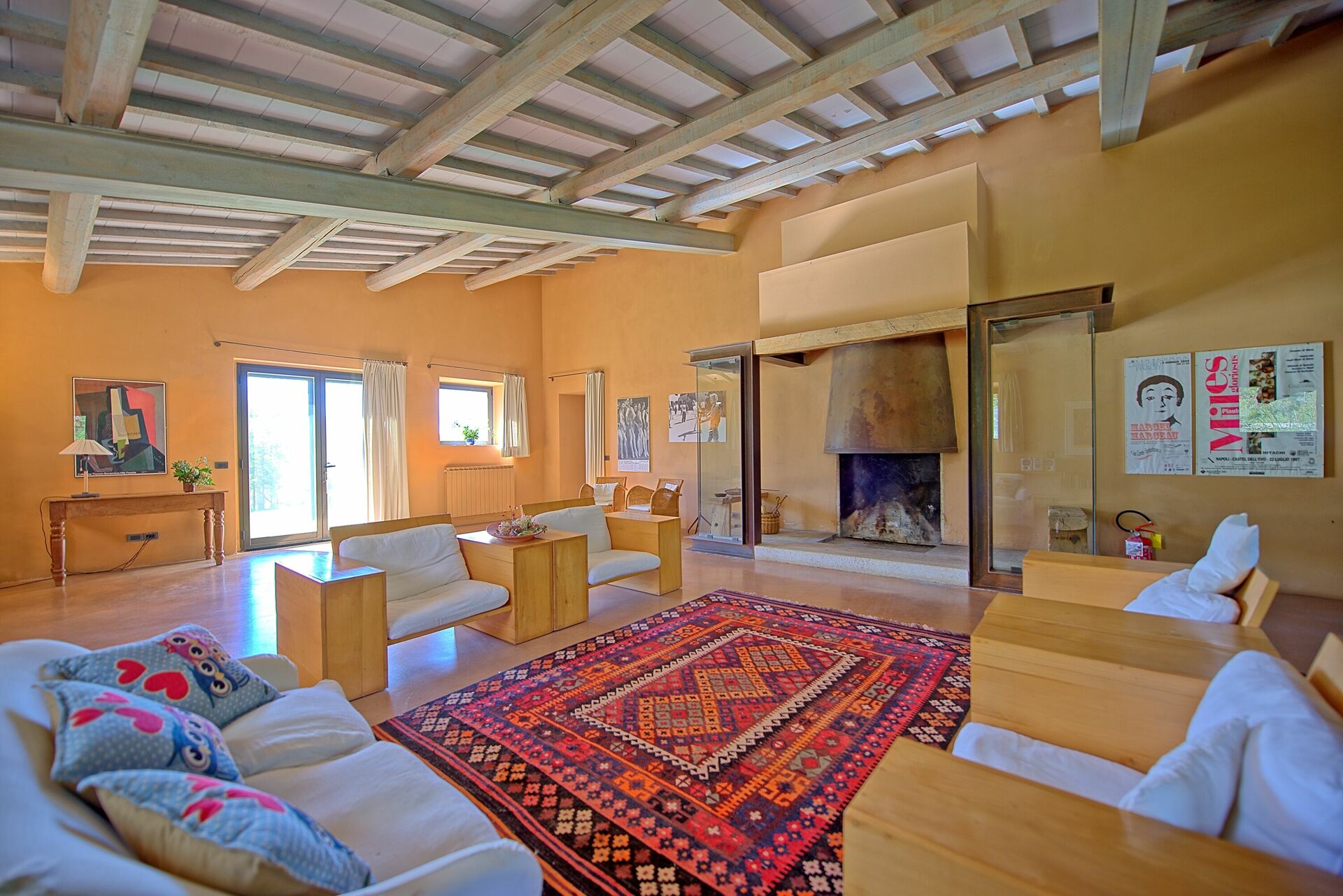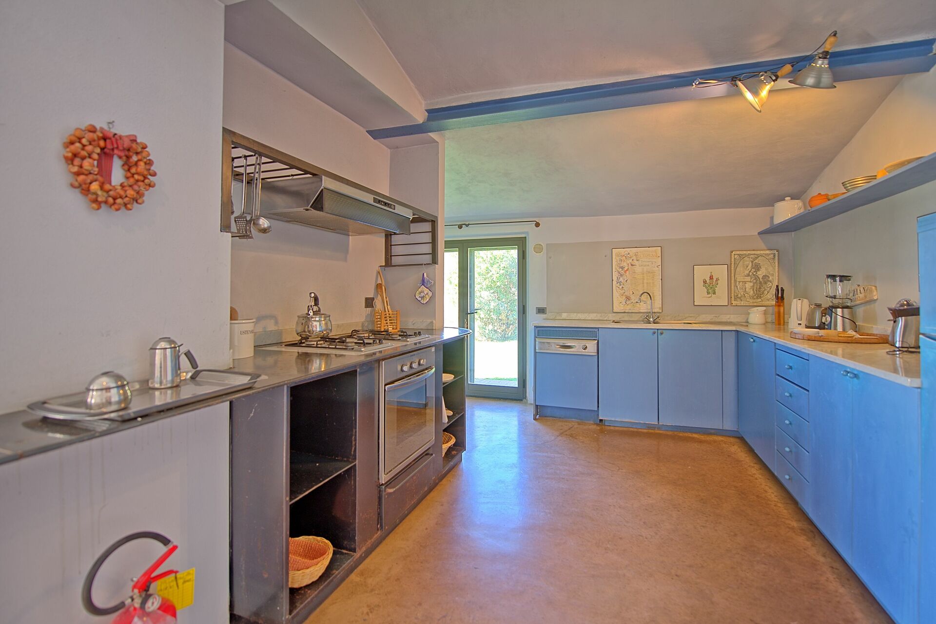 Ground Floor: entrance into a small living area, a door leading into the large living room with big fireplace sofas and arm chairs, on the left of the small living there is a dining room with large table, form the dining area a door give the access to the fully equipped kitchen with gas stove (4 burns), electric over, toaster, fridge, freezer, dish washer, there is also an original wood oven for pizza. From the dining room there is the access to the night area in the ground floor with 3 bedrooms each with two French beds, all bedrooms have its own bathroom with bathtub, one of these bedrooms has direct access to the garden and a little living area.