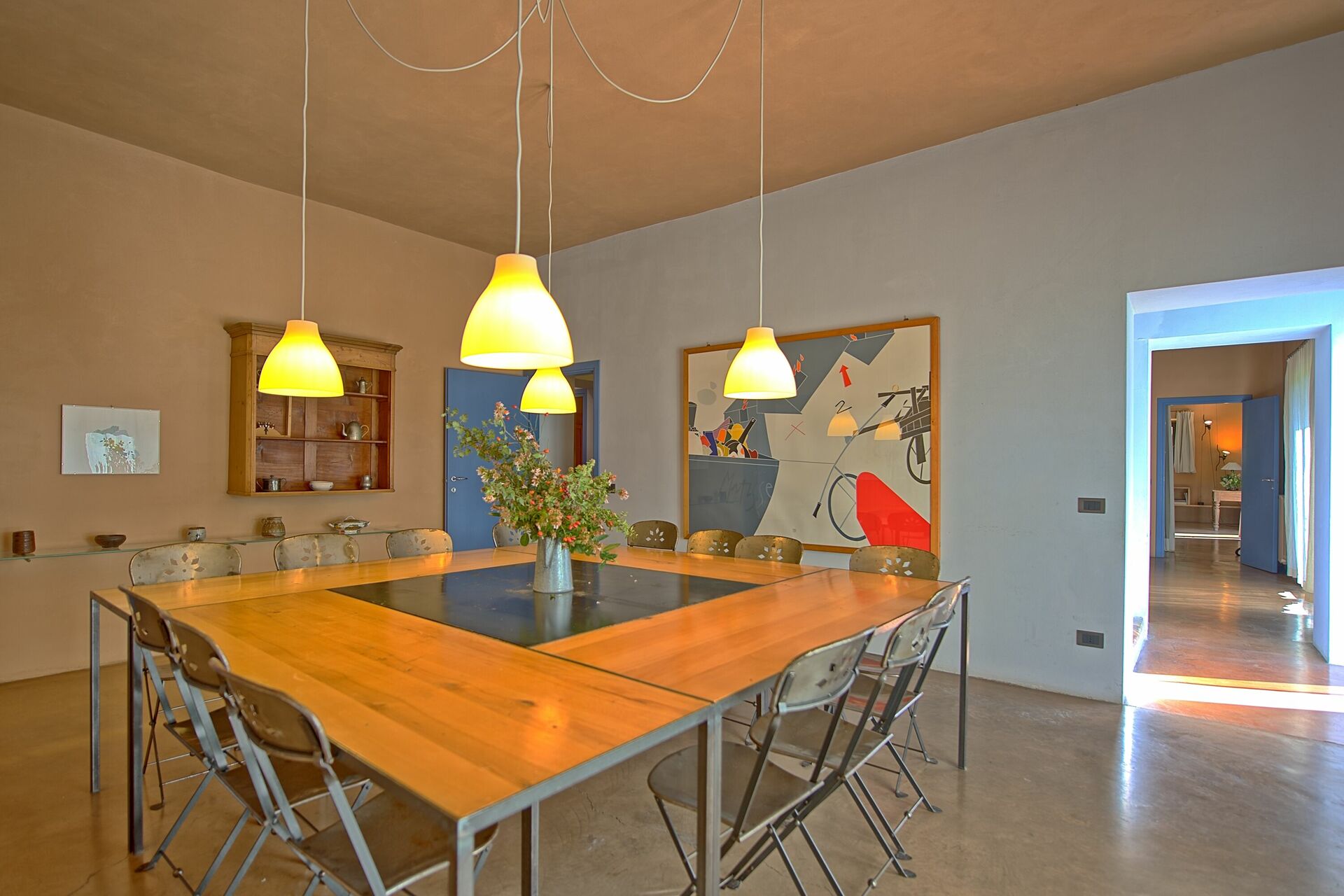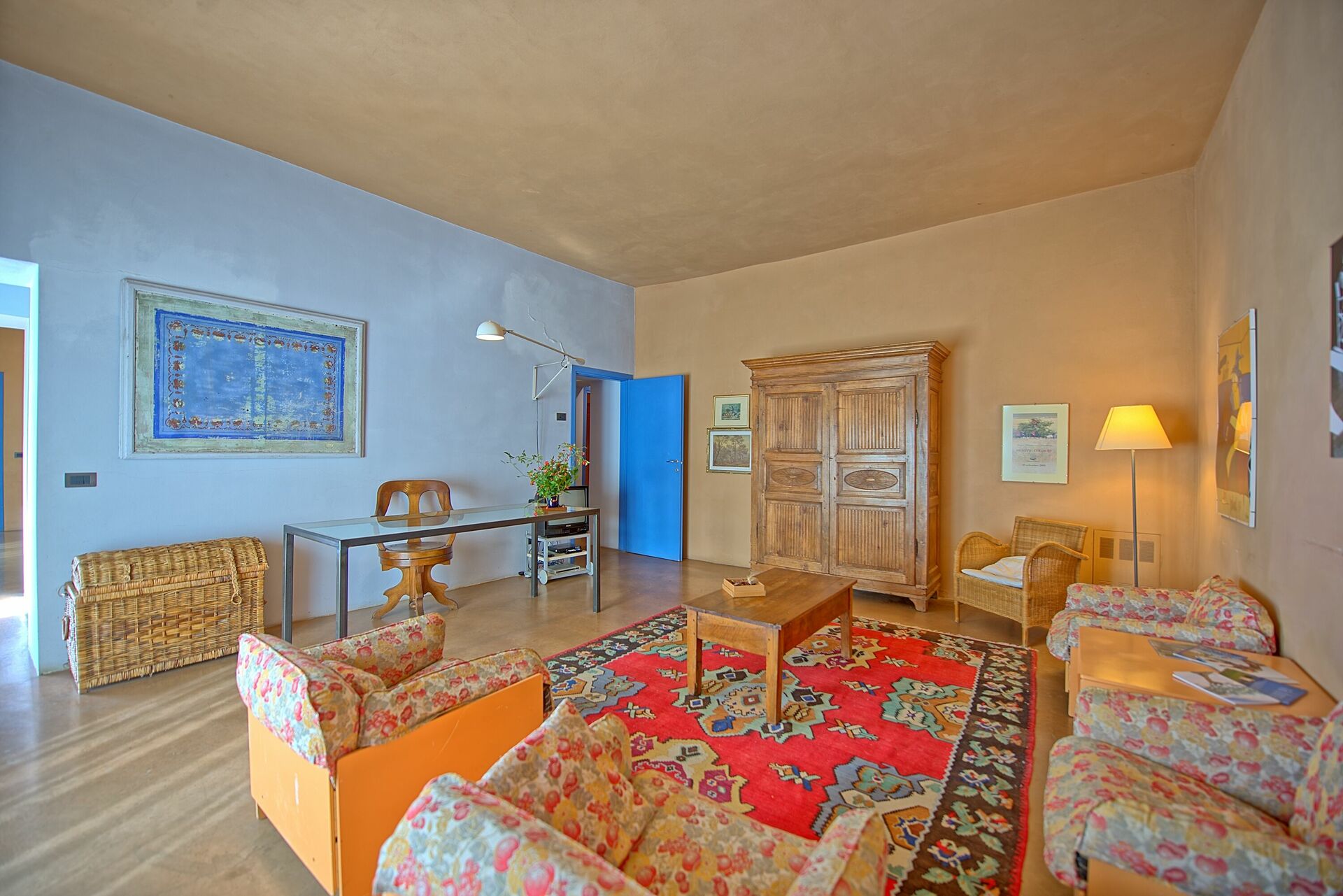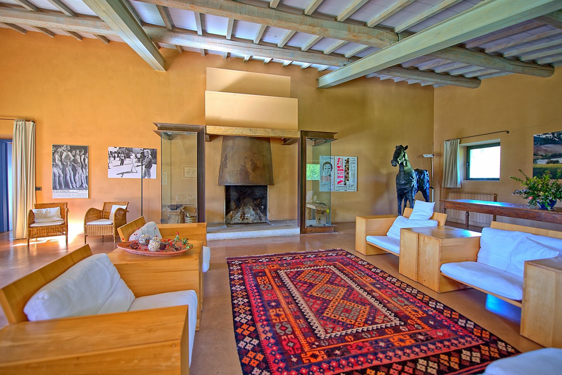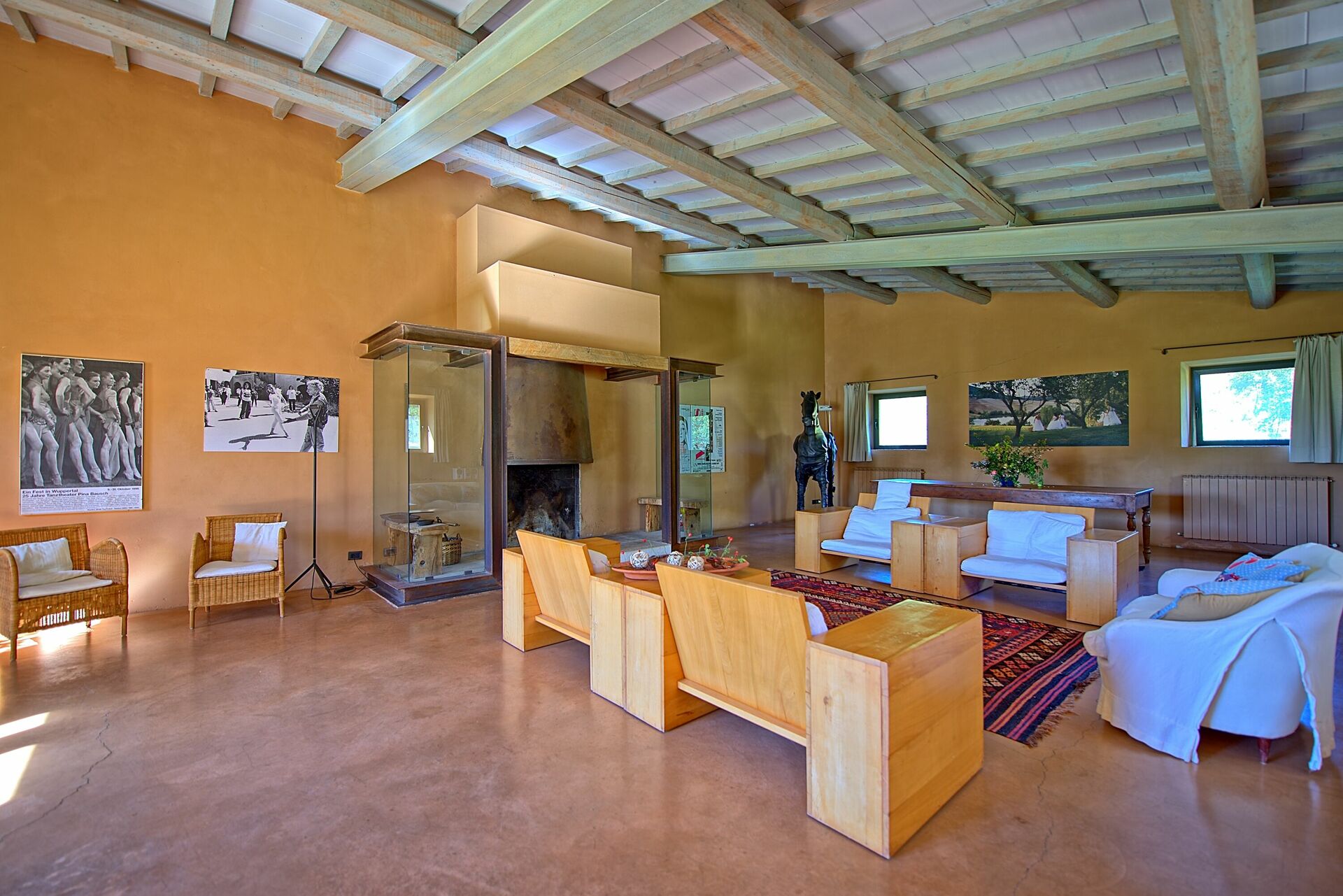 Ground Floor: entrance into a small living area, a door leading into the large living room with big fireplace sofas and arm chairs, on the left of the small living there is a dining room with large table, form the dining area a door give the access to the fully equipped kitchen with gas stove (4 burns), electric over, toaster, fridge, freezer, dish washer, there is also an original wood oven for pizza. From the dining room there is the access to the night area in the ground floor with 3 bedrooms each with two French beds, all bedrooms have its own bathroom with bathtub, one of these bedrooms has direct access to the garden and a little living area.