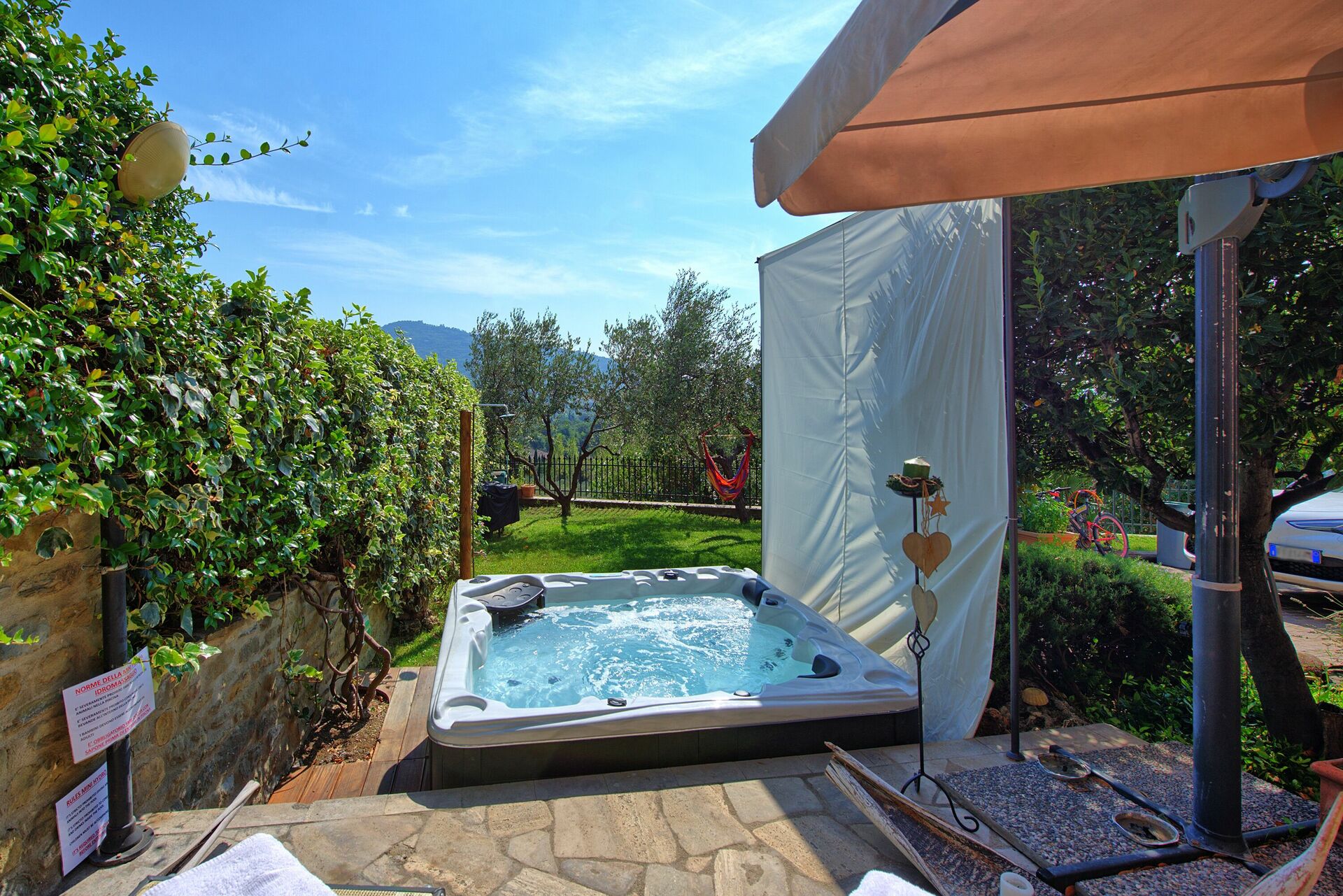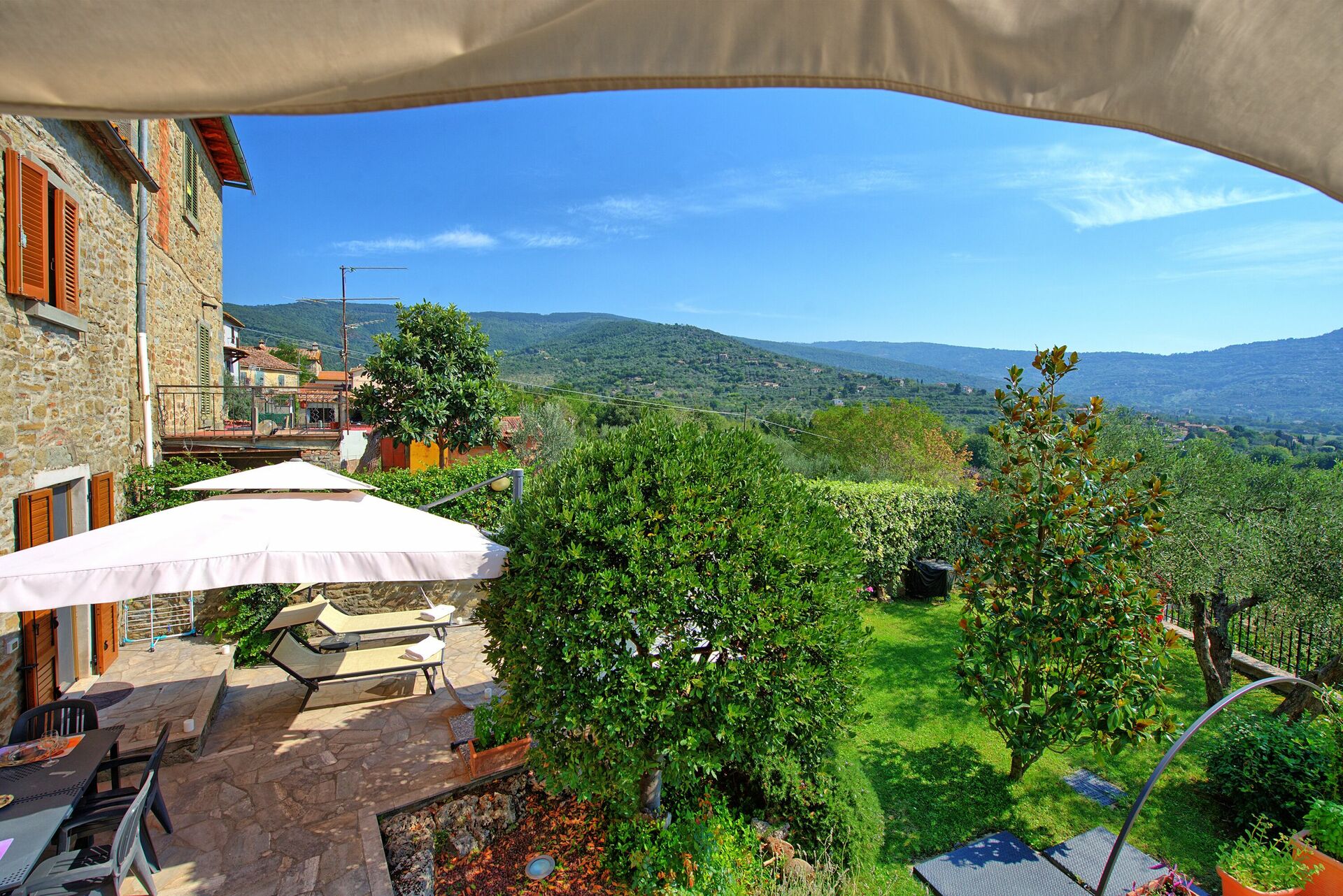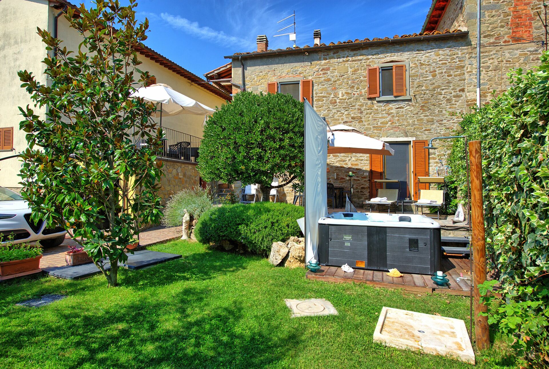 Picture this, if you will: a pretty villa in a small town with the lush greenery of trees and views over the vineyards and rolling hills of the Tuscan countryside all around, a front entrance opening into a little court with flowers and trees, climbing blooms and vines winding up the sunny yellow facade of the villa, green shuttered windows, a romantic balcony on the first floor above the entrance, and a terracotta roof to top it off. This is the dreamy first encounter that guests have when they reach Villa Toppani Del Sodo and this very much sets the appropriate tone for your vacation here.