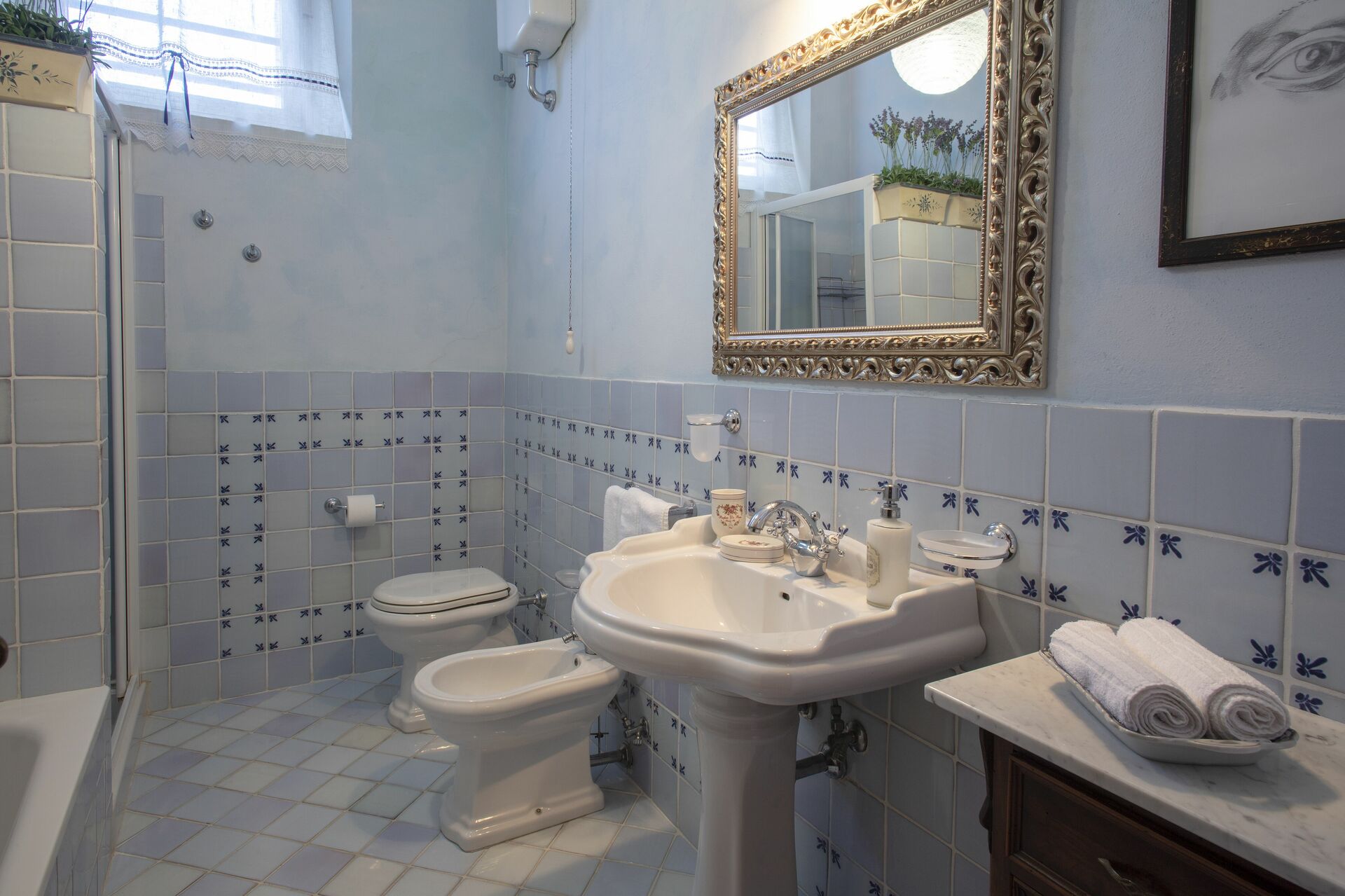 Bathroom: basin, toilet, bidet, shower.