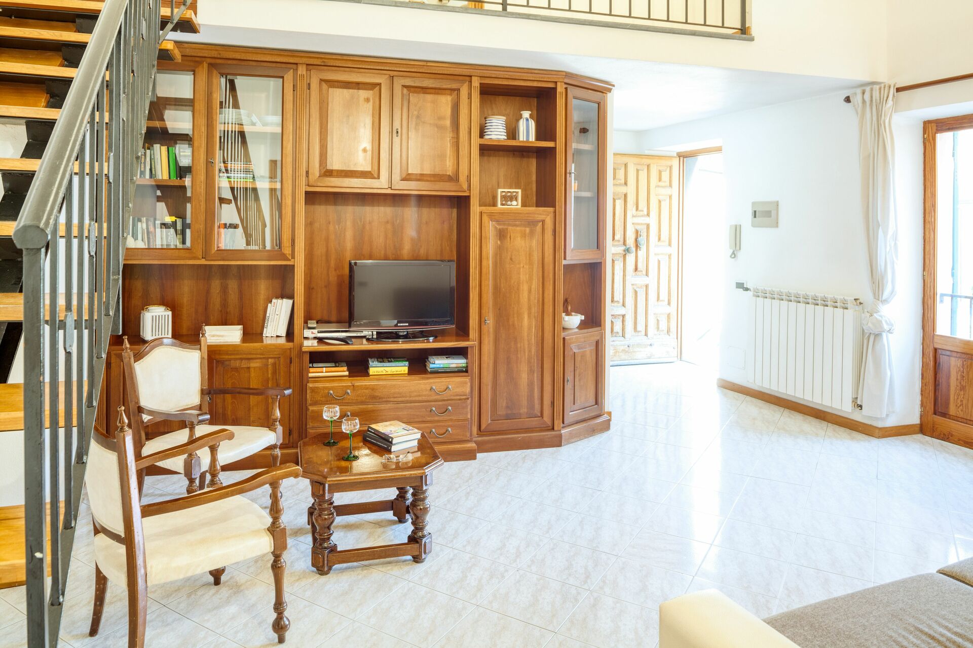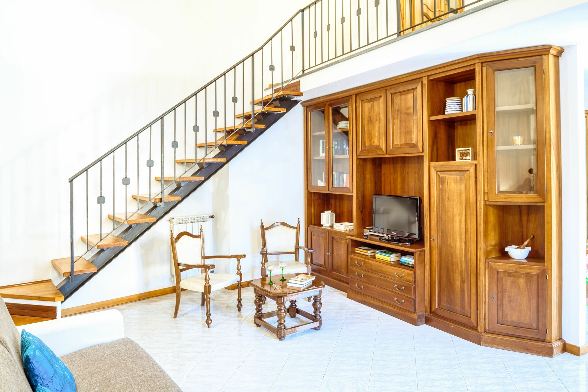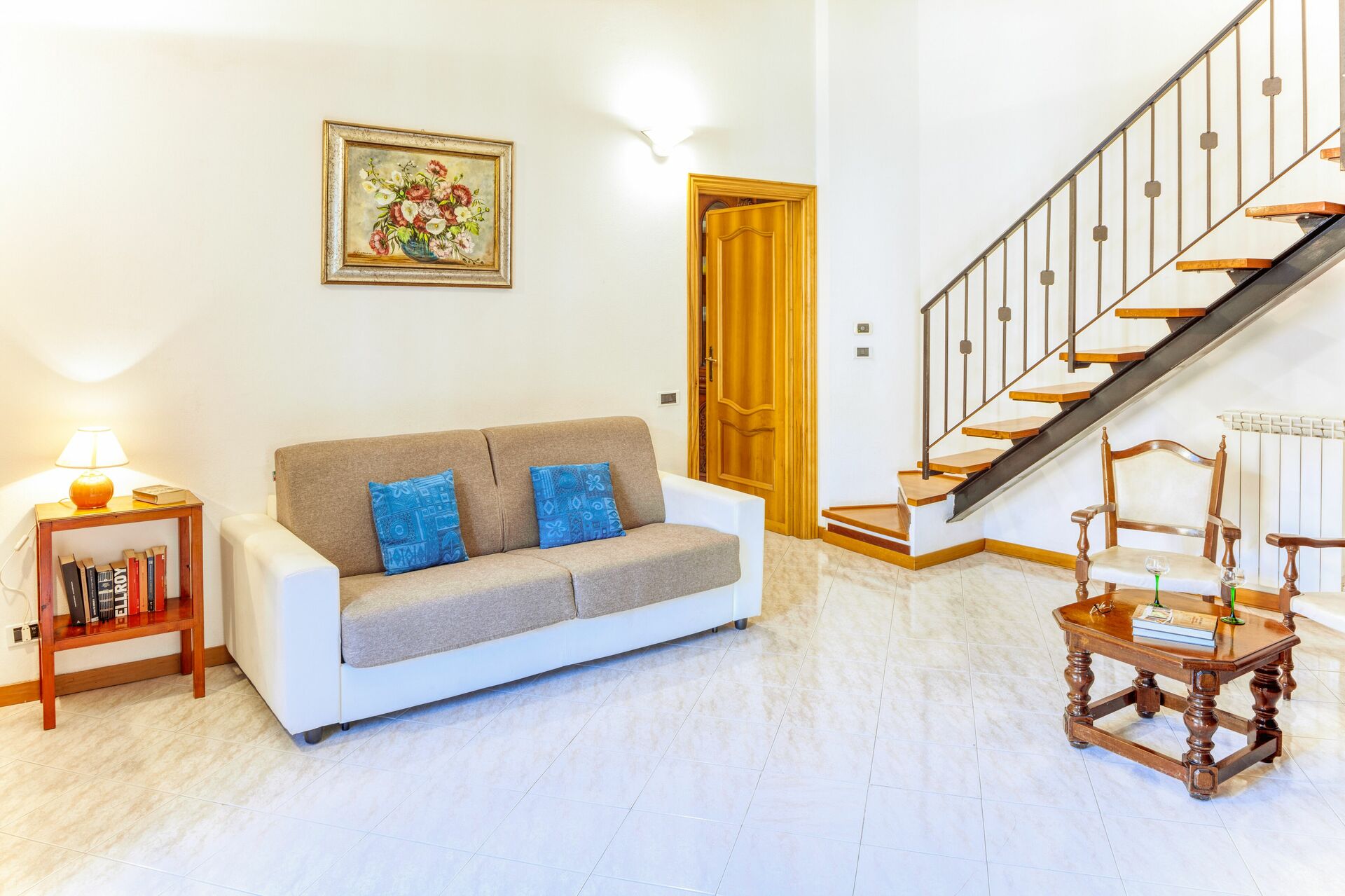 The apartment is composed of a large living room, a well-equipped kitchen, a double bedroom, a single bedroom, a small bathroom on the lower floor, and a full bathroom on the upper floor.