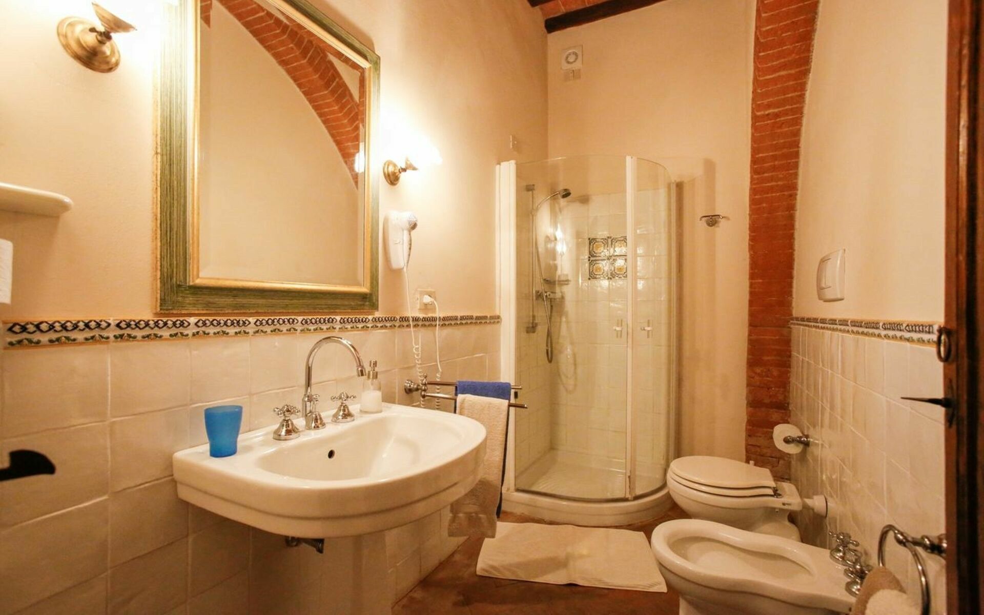 Bathroom: basin, toilet, bidet, shower, hairdryer.