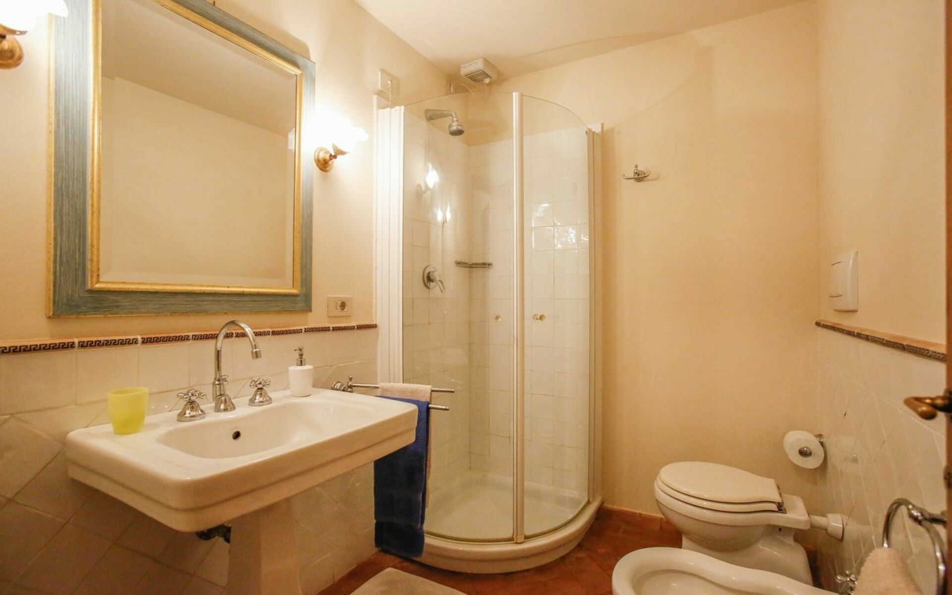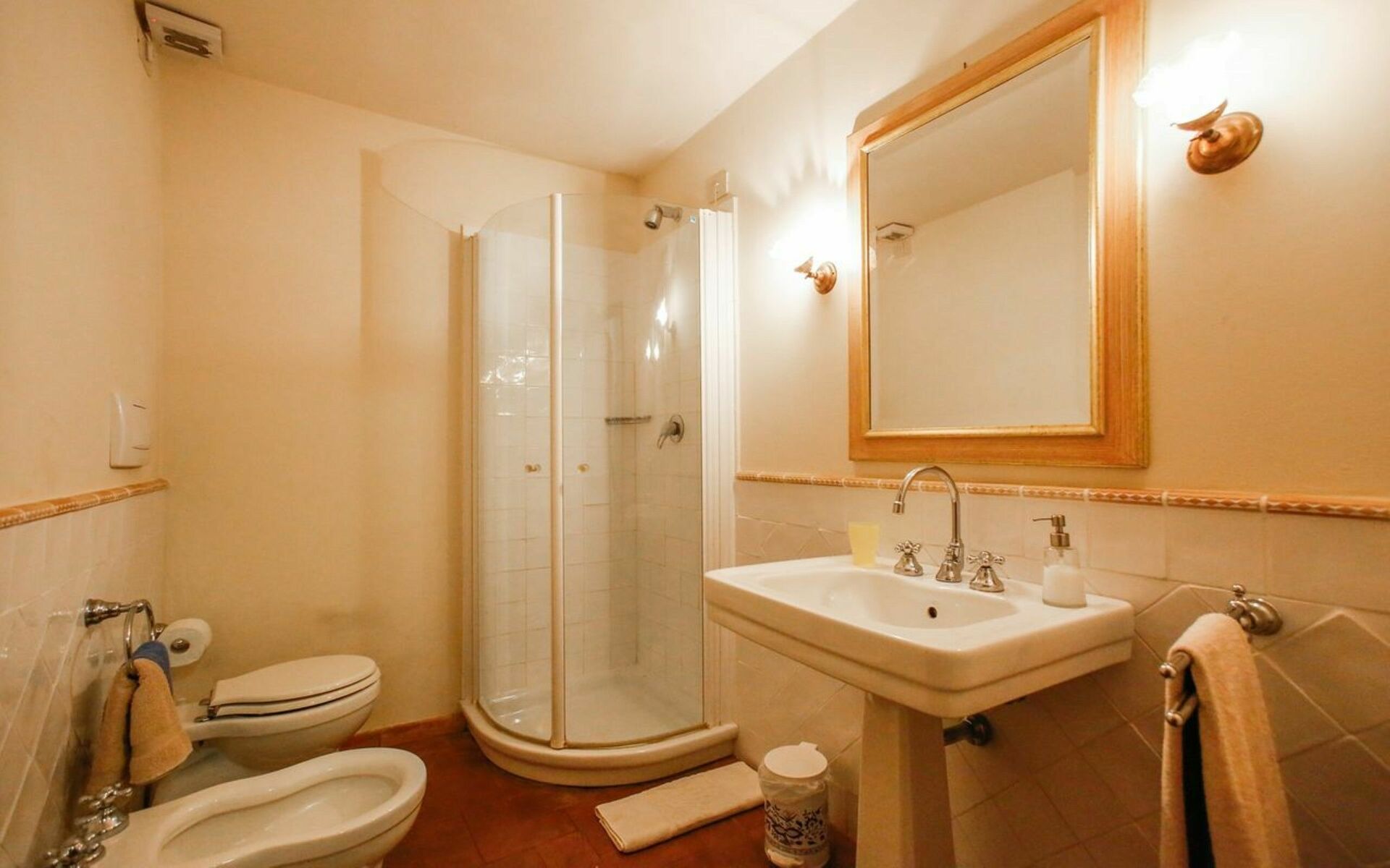 Bathroom: basin, toilet, bidet, shower.