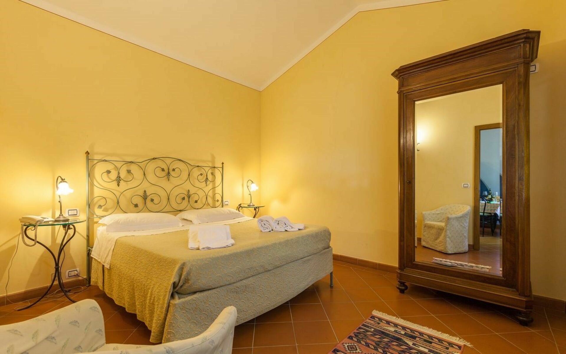 Bedroom + Ensuite Bathroom: air conditioning double bed, armchair, working desk, basin, bidet, shower.