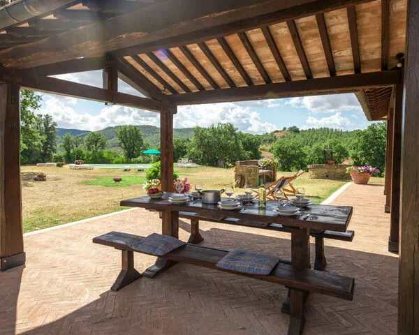 The outdoor spaces of "Casale Poggio Lupinaio" are thoughtfully designed to complement the natural beauty of the surrounding Tuscan landscape. The expansive garden, spanning the full breadth of the 5,000-square-meter grounds, is adorned with trees and open meadow areas, offering ample space for leisurely strolls and outdoor enjoyment. At the heart of the exterior is the impressive 4 x 10-meter swimming pool, equipped with an internal staircase for easy and safe access. The pool is available for use from May 15th through September 24th, making it the perfect companion for a summer escape. Complementing the pool area, an outdoor shower provides added practicality after a swim, while a dedicated terrace furnished with garden furniture offers a welcoming space for al fresco dining, relaxing in the sun, or simply taking in the tranquil hillside views.