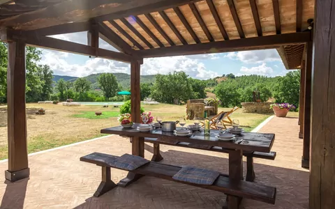 Casale Poggio Lupinaio is a beautiful detached country house nestled in the heart of the Italian countryside, offering a peaceful vacation rental retreat. Surrounded by trees and fields, this property boasts a 5,000 square meter private estate with a large garden and meadow. You can enjoy a refreshing swim in the 4 x 10-meter swimming pool, complete with an internal staircase, outdoor shower, and furnished terrace. The house is equipped with amenities such as Internet WiFi, central heating, and parking facilities.