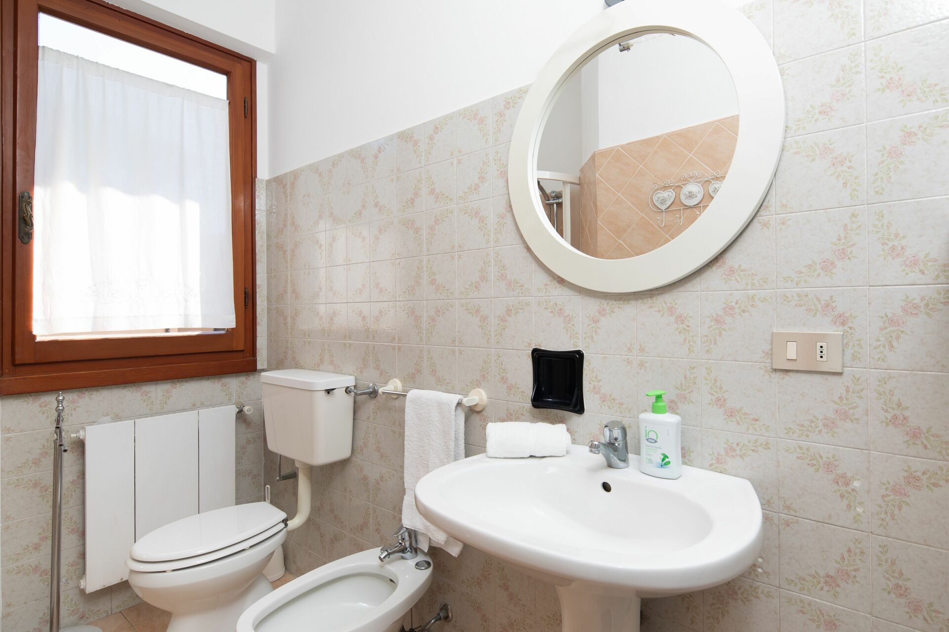 Bathroom: basin, toilet, bidet, shower.