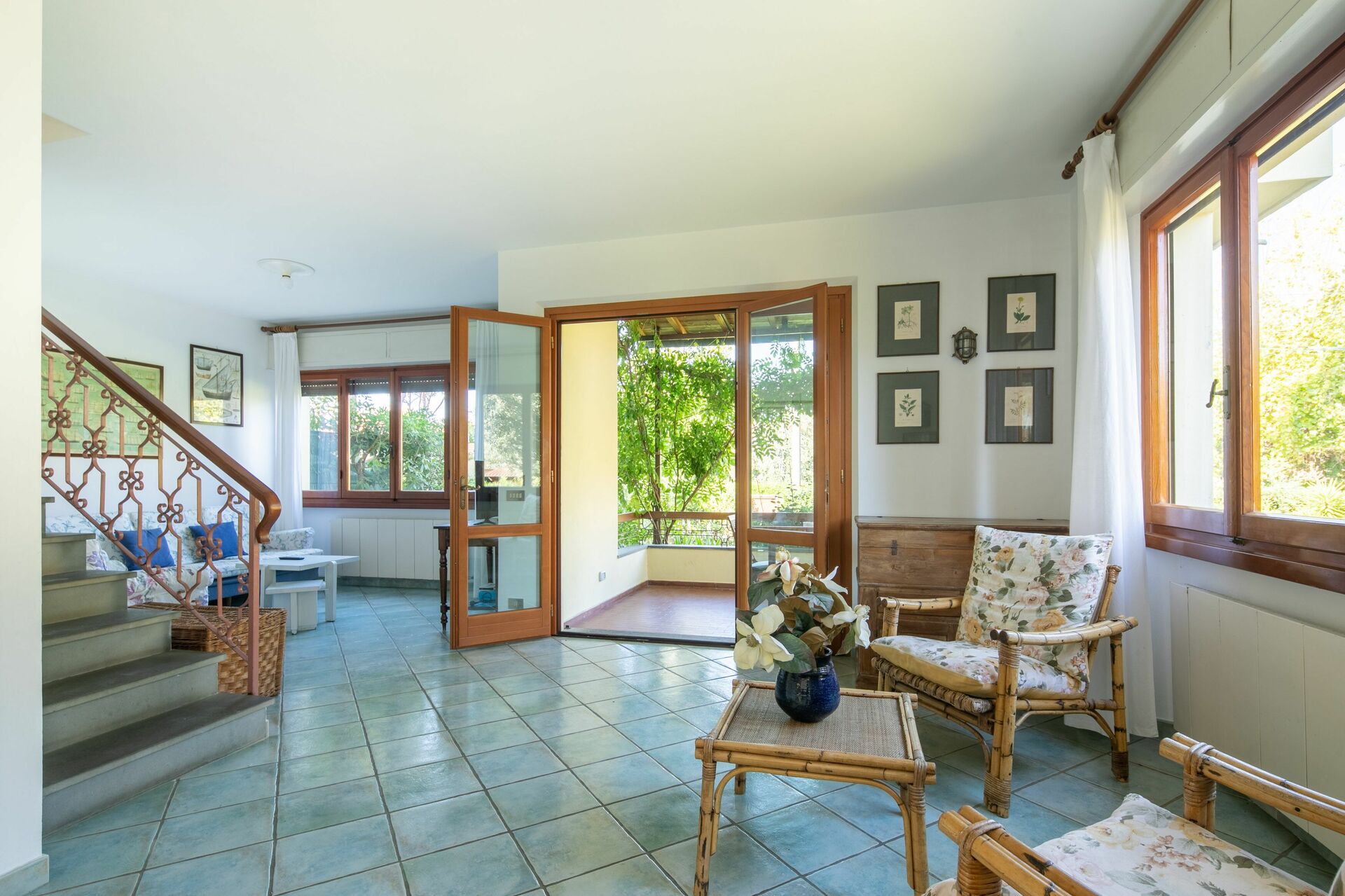 Living room: sofa, armchair, television, exit to the terrace.