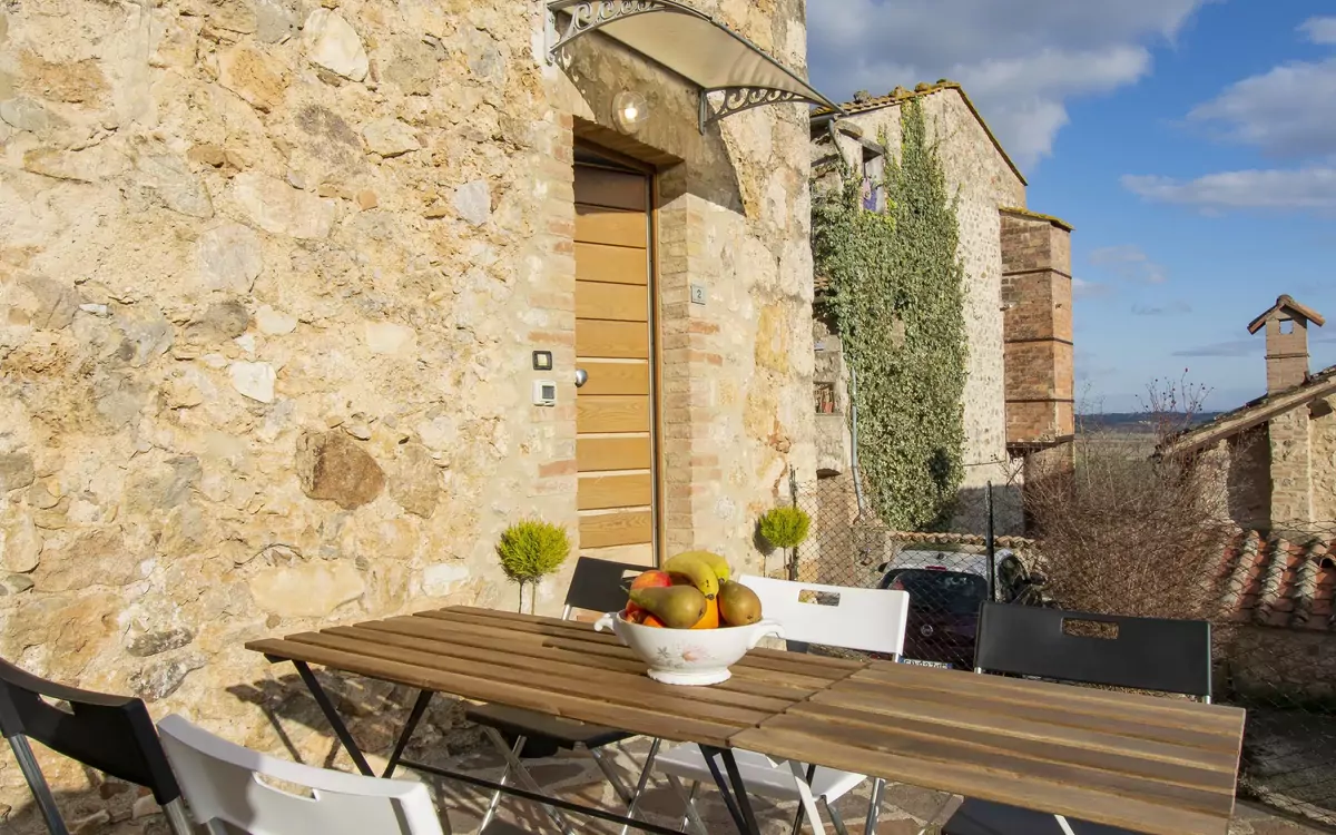 The elevated position of Casa Francesca allows you to fully appreciate the quiet beauty of the Rosia Alta district from the exterior of the property. The outdoor spaces surrounding this historic home reflect the sunny and peaceful character of the setting, offering a welcoming environment in which to relax and enjoy the natural Tuscan atmosphere. The yard provides an inviting open-air area where you can unwind, soak up the sunshine, and take in the surrounding residential landscape at your leisure.