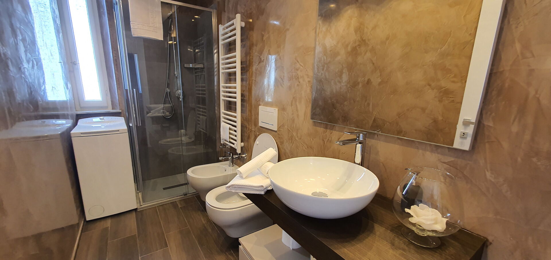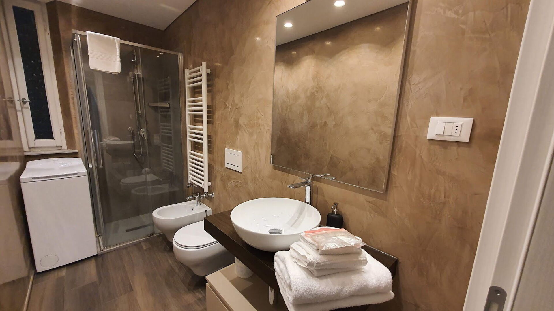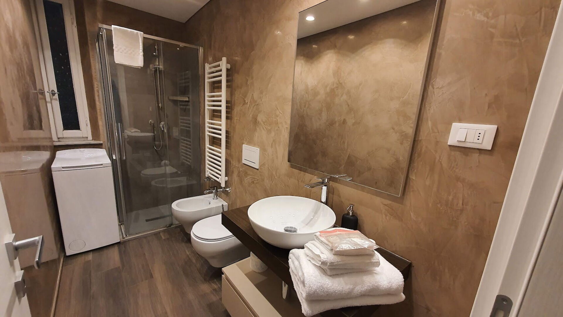 Bathroom: basin, toilet, bidet, shower, washing machine.