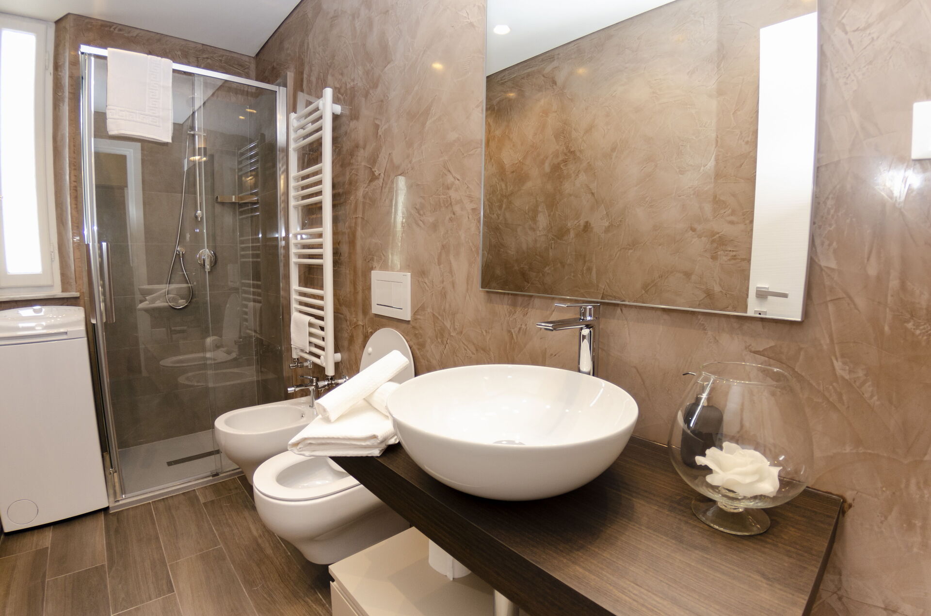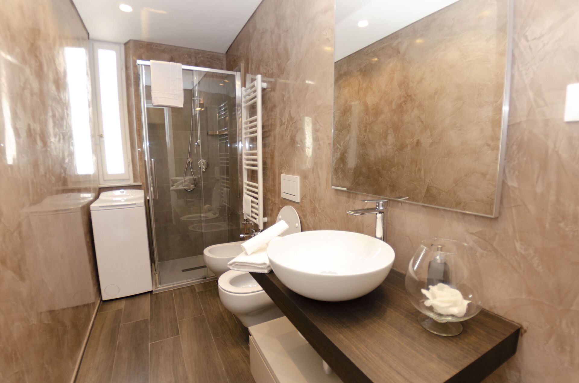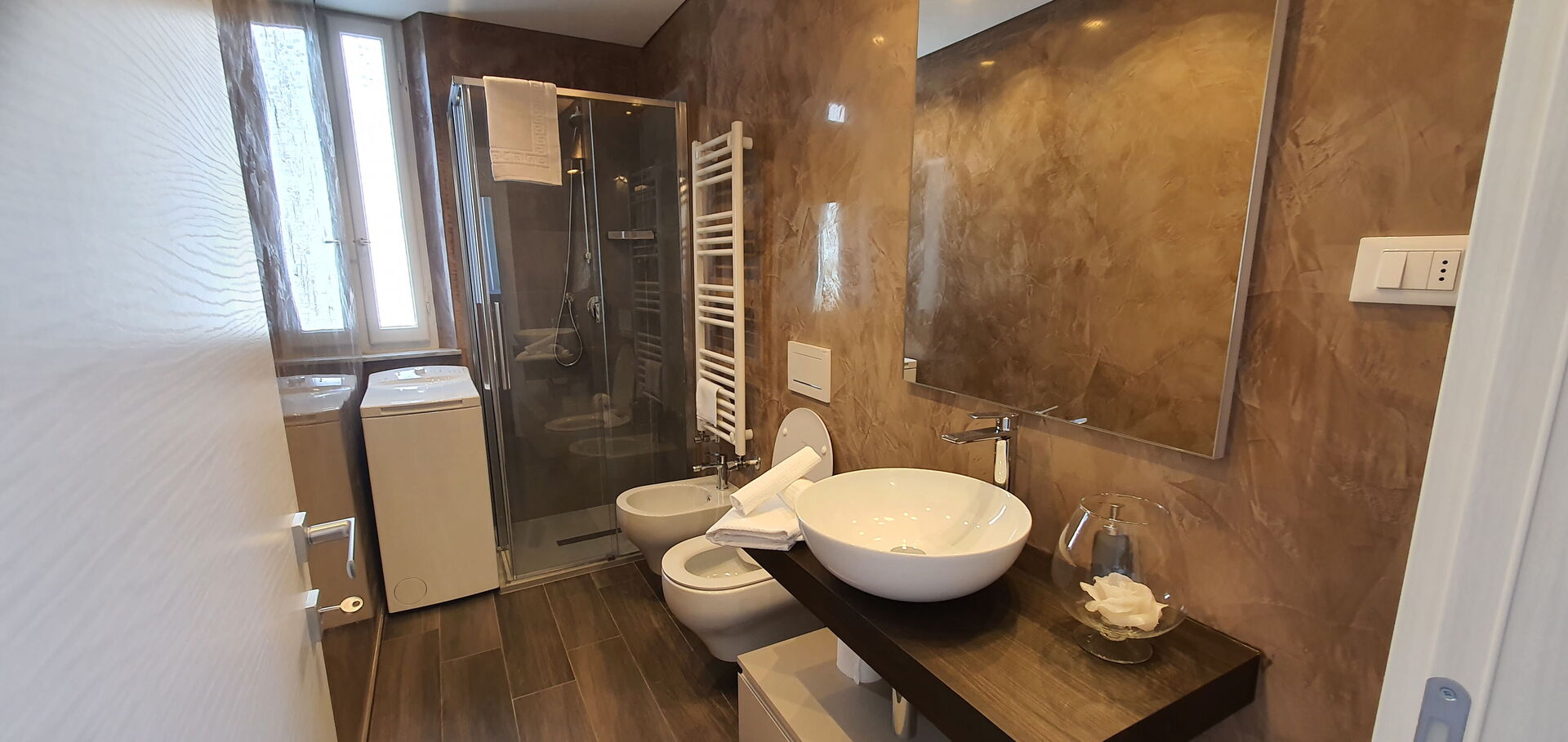 Bathroom: basin, toilet, bidet, shower, washing machine.