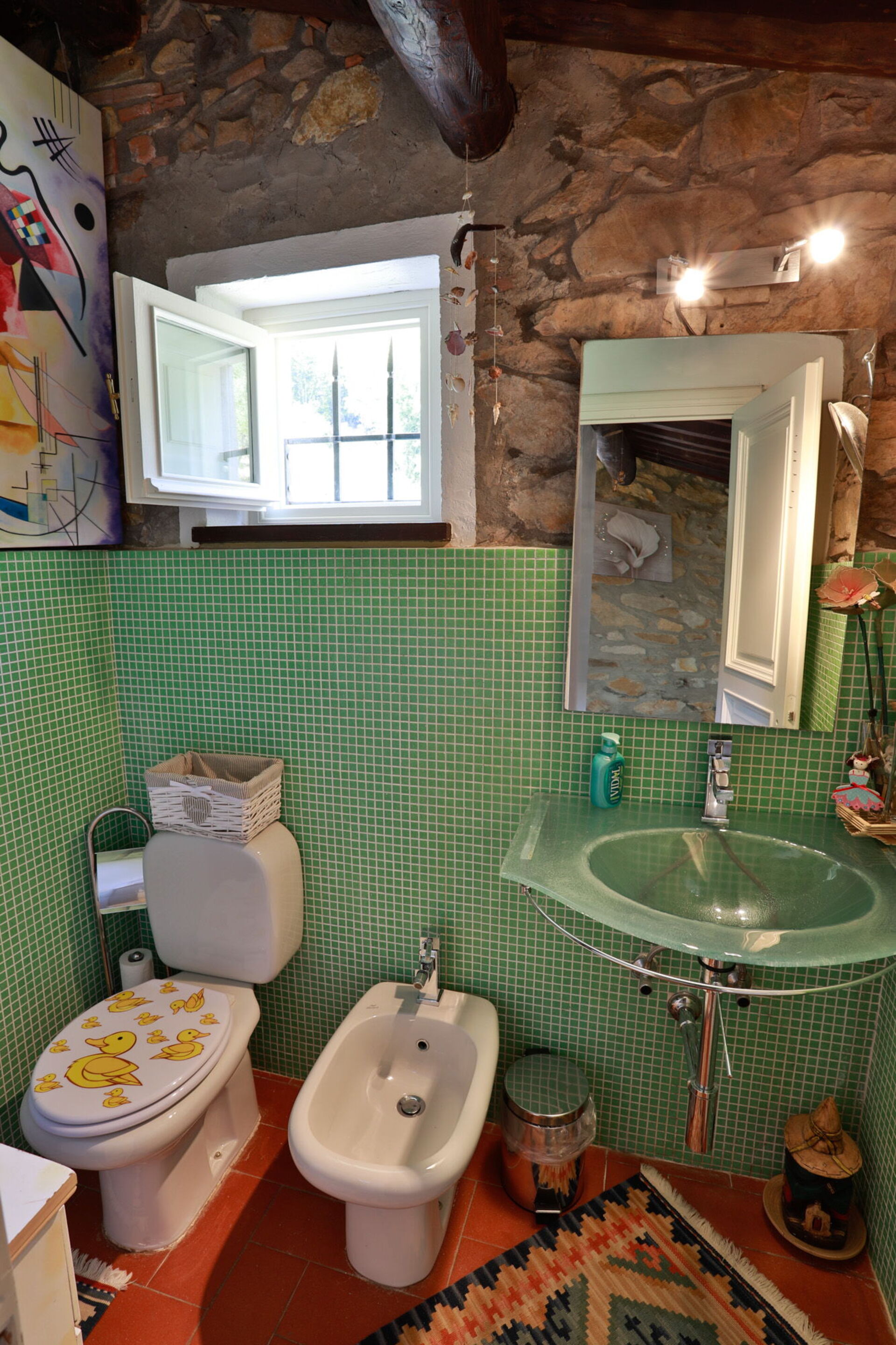 Bathroom: basin, toilet, bidet, shower.