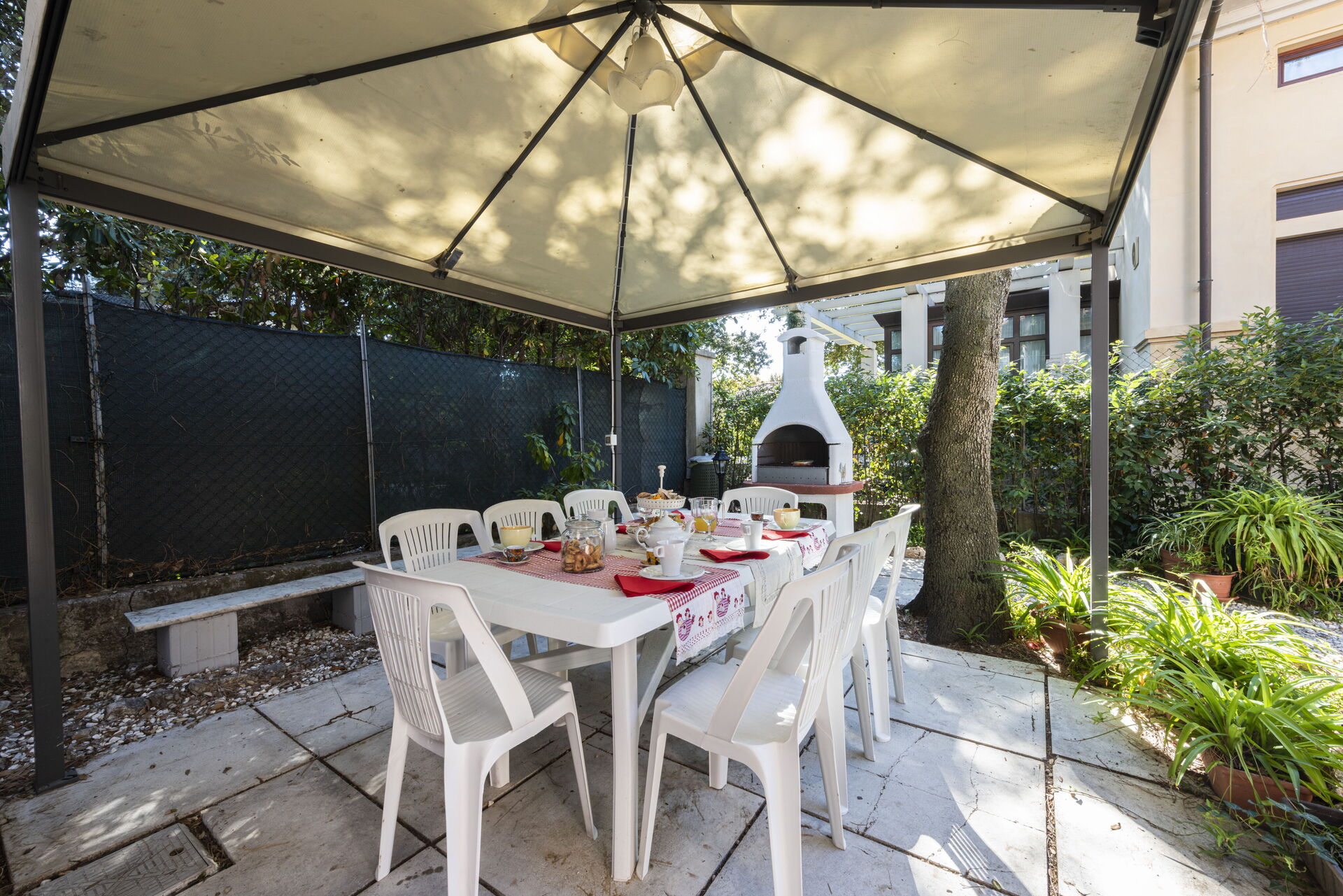 Garden: barbecue, al fresco dining, dining table (people: 8), gazebo, garden furniture, fenced.