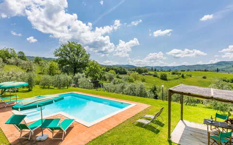 "L'Angolo di Uzzano" is a stunning holiday rental set within a peaceful hamlet of just five houses, perched atop a hill in the heart of Greve in Chianti, Italy. Surrounded by trees, fields, and the iconic vineyards of the Chianti region, this beautifully positioned 2-family house offers a quiet and sun-drenched retreat overlooking the breathtaking Tuscan countryside. The property extends across two hectares of well-maintained terraced garden, where lush plants and mature trees create a truly idyllic natural setting. Guests have access to a private swimming pool measuring 5 x 10 m, available seasonally between 1 May and 30 September, ensuring refreshing outdoor enjoyment during the warmer months. The expansive yard provides ample space for relaxation and outdoor living, while a tennis court located just 2 km from the property offers additional recreational opportunities. Parking is conveniently available directly at the house, and Internet WiFi connectivity ensures that guests remain comfortably connected throughout their stay.