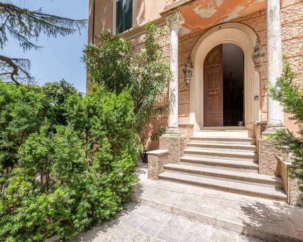 The villa is situated directly alongside a road, offering straightforward accessibility for arriving guests. The property comprises 8 individual apartments distributed across 3 storeys of this characterful 1930s building, providing a variety of accommodation options within a shared historic setting. The surrounding park and outdoor areas are available for the shared enjoyment of all guests staying at the property, fostering a convivial yet relaxed atmosphere throughout the estate.