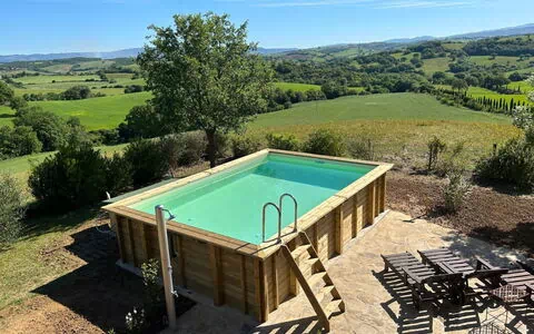 Le Calle is a cosy, rustic two-storey detached house surrounded by meadows and vineyards in Cinigiano, Italy. It offers a fenced garden with a lawn, a wildlife garden, and a private above-ground swimming pool (3 x 4 m, seasonal availability: 01.Jun. - 30.Sep.). The property also features Internet Wifi, Parking, and access to a shared swimming pool (6 x 12 m, depth 120 - 170 cm, seasonal availability: 01.May. - 30.Oct.) in the complex.