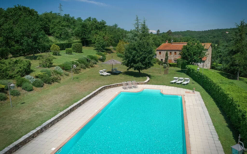 Vacation rental Fonte Nuova - Badia Agnano, Toscana is a lovely stone building (380 sq m) that includes internet and private pool. The property can accommodate up to 13 guests comfortably in six bedrooms with six bathrooms. Conveniently located 2 km (1 mi) from Badia Agnano, Italy in the tourist area "Arno Valley" and only 26 km (16 mi) from Arezzo.