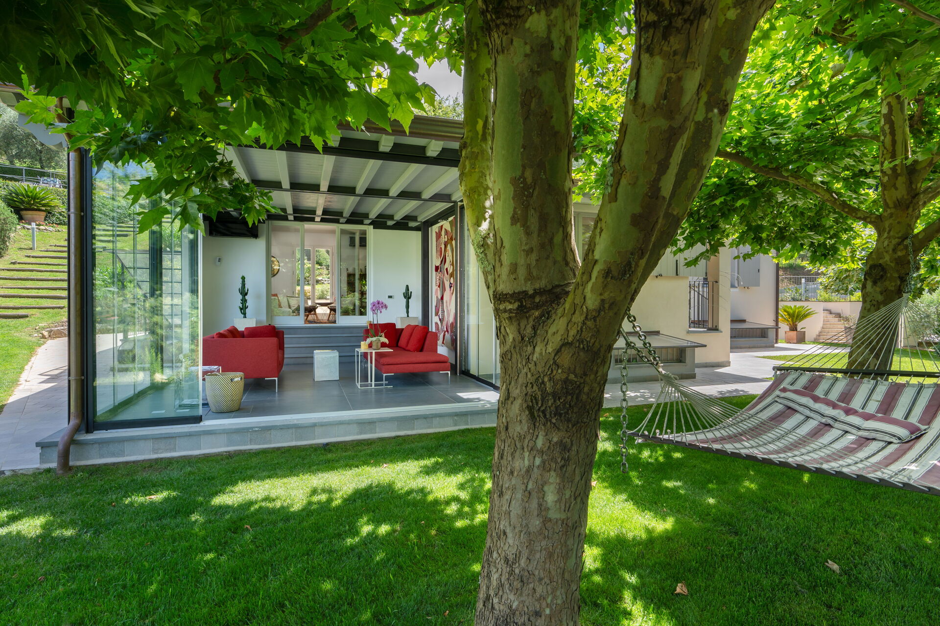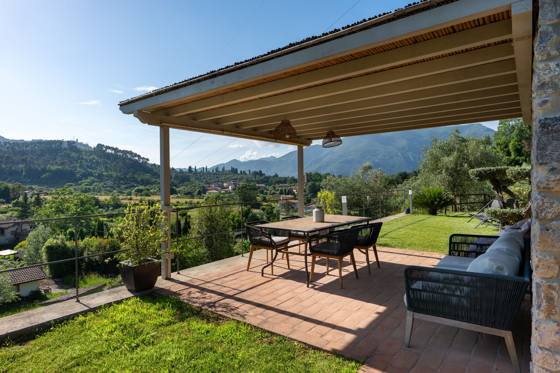 Property Luxury Green Marignana Villa, Versilia, Pool, Ac, is a beautiful property (240 sq m) that includes hot tub, WiFi internet and air conditioning. The property can sleep up to eight people comfortably in four bedrooms with four bathrooms. Conveniently located 9 km (6 mi) from Camaiore, Italy and only 13 km (8 mi) from Viareggio.