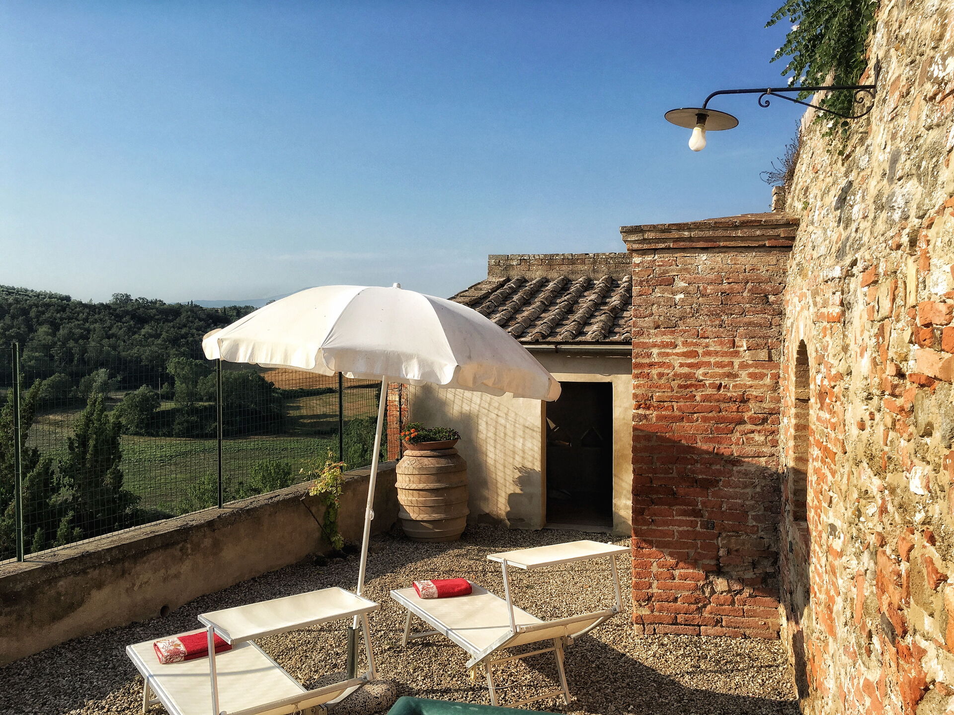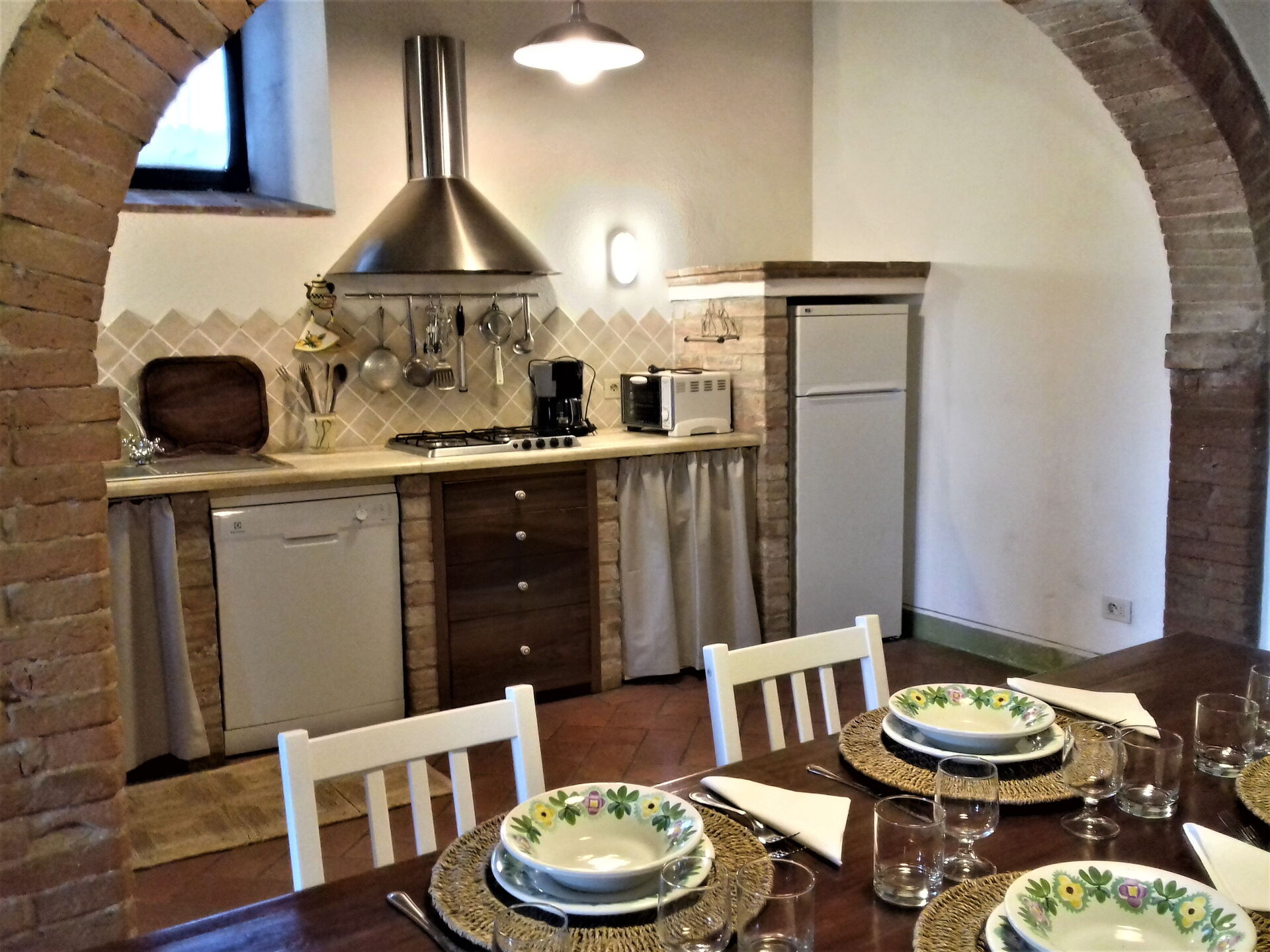 After arriving at Casa Le Crete you’ll find a beautiful clean well-maintained property with views of the hills ideal for a relaxing vacation in Tuscany. After a busy day of sightseeing, spend some time with friends and family poolside enjoying a glass of wine - a perfect way to relax at the end the day. Also available outdoors are a barbecue grill and patio. Sharing a meal with friends and family is a big part of the Tuscan culture. Take advantage of the well-equipped kitchen to prepare meals using local produce while on your vacation. The kitchen includes coffee machine, toaster, stove and refrigerator, as well as, plenty of tableware and cutlery for up to five people. Dine 'al fresco' like a real Tuscan, the fully furnished patio is the perfect setting to enjoy food, family and the beautiful Tuscan weather.