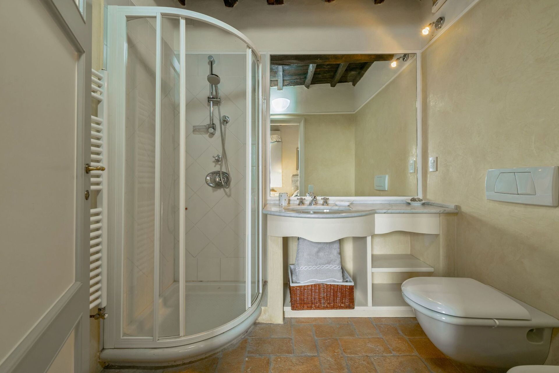 First floor: The upper floor houses the sleeping area with 5 bedrooms divided as follows: 1 double bedroom with ensuite bathroom (with bathtub); 1 twin with ensuite bathroom (with shower); 1 twin with ensuite bathroom (with bathtub); 1 double with private terrace and 1 twin sharing access to a bathroom with shower.