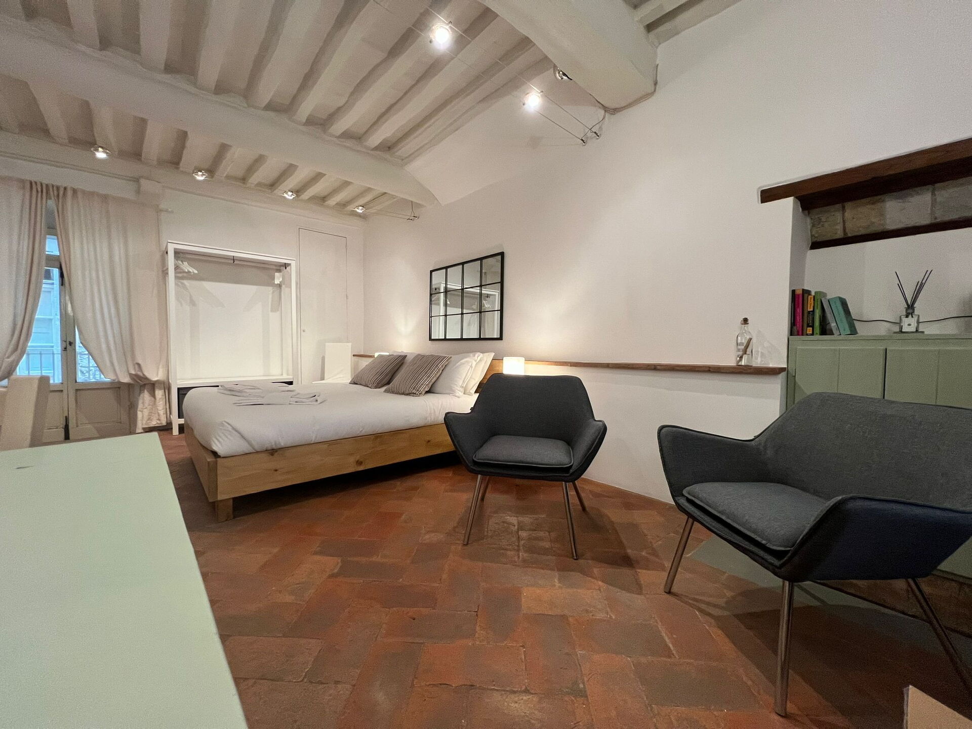 Open space: two armchairs, dining table (people: 4), double bed, WIFI internet, satellite tv, fridge, dishwasher, microwave, toaster, american coffee machine.