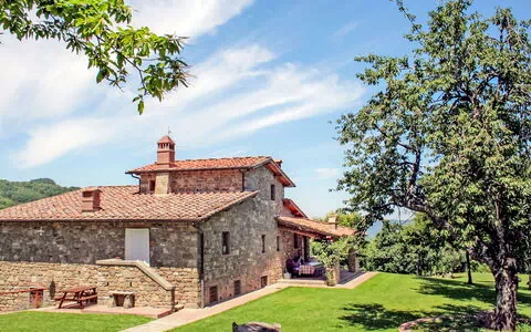Il Poggio is a beautiful farmhouse divided into three residential units, offering the option to book two of the available apartments for a single group. The apartments are located on the raised ground floor and connected from the outside, ensuring maximum independence with independent kitchenettes. Surrounded by trees, meadows, and fields, this rustic 3-family house boasts a large, well-kept garden with plants and trees, a private garden, and a seasonal swimming pool (12 x 6 m, depth 120 - 160 cm, available from 10.May. - 04.Oct.). It also features an outdoor shower, garden furniture, and a barbecue area, making it an ideal holiday rental for families or seniors seeking a relaxing vacation.