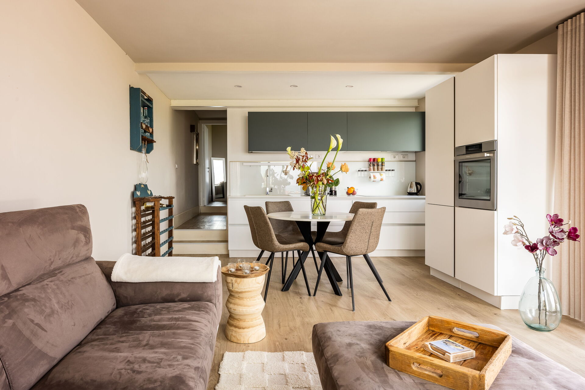 Including: kitchen + living room, bedroom, bathroom.