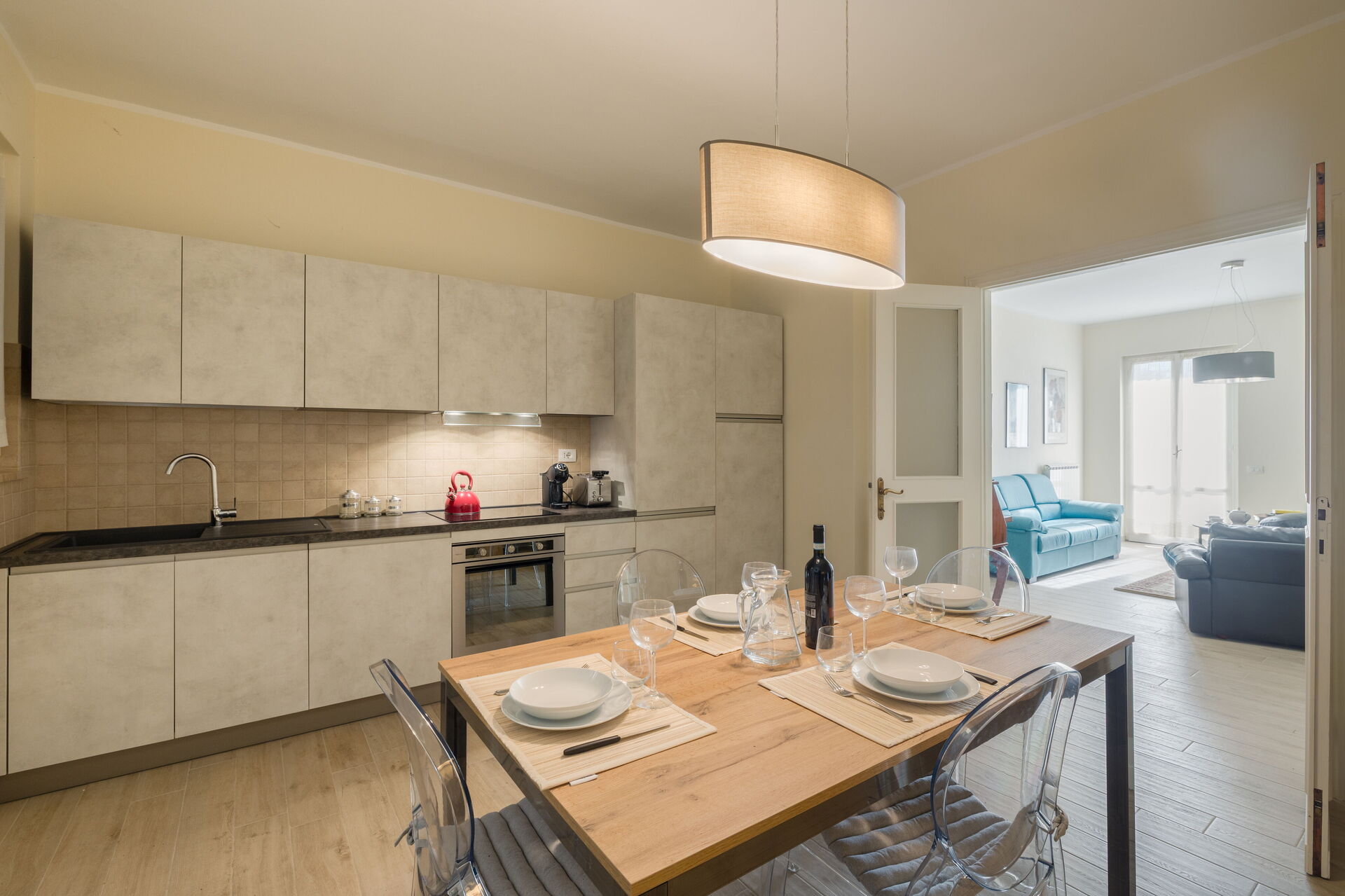 Kitchen: well equipped kitchen, dining table (people: 6), dishwasher, fridge, freezer, microwave, stove top, oven, toaster, iron, italian coffee machine, american coffee machine, WIFI internet, air conditioning, exit to the garden.