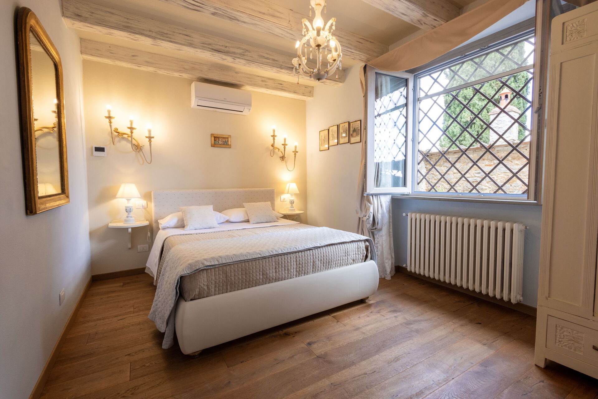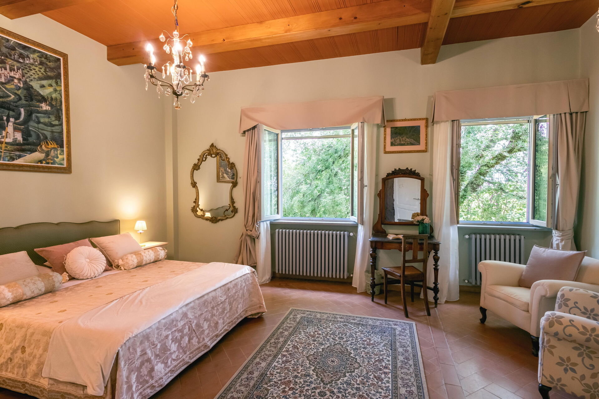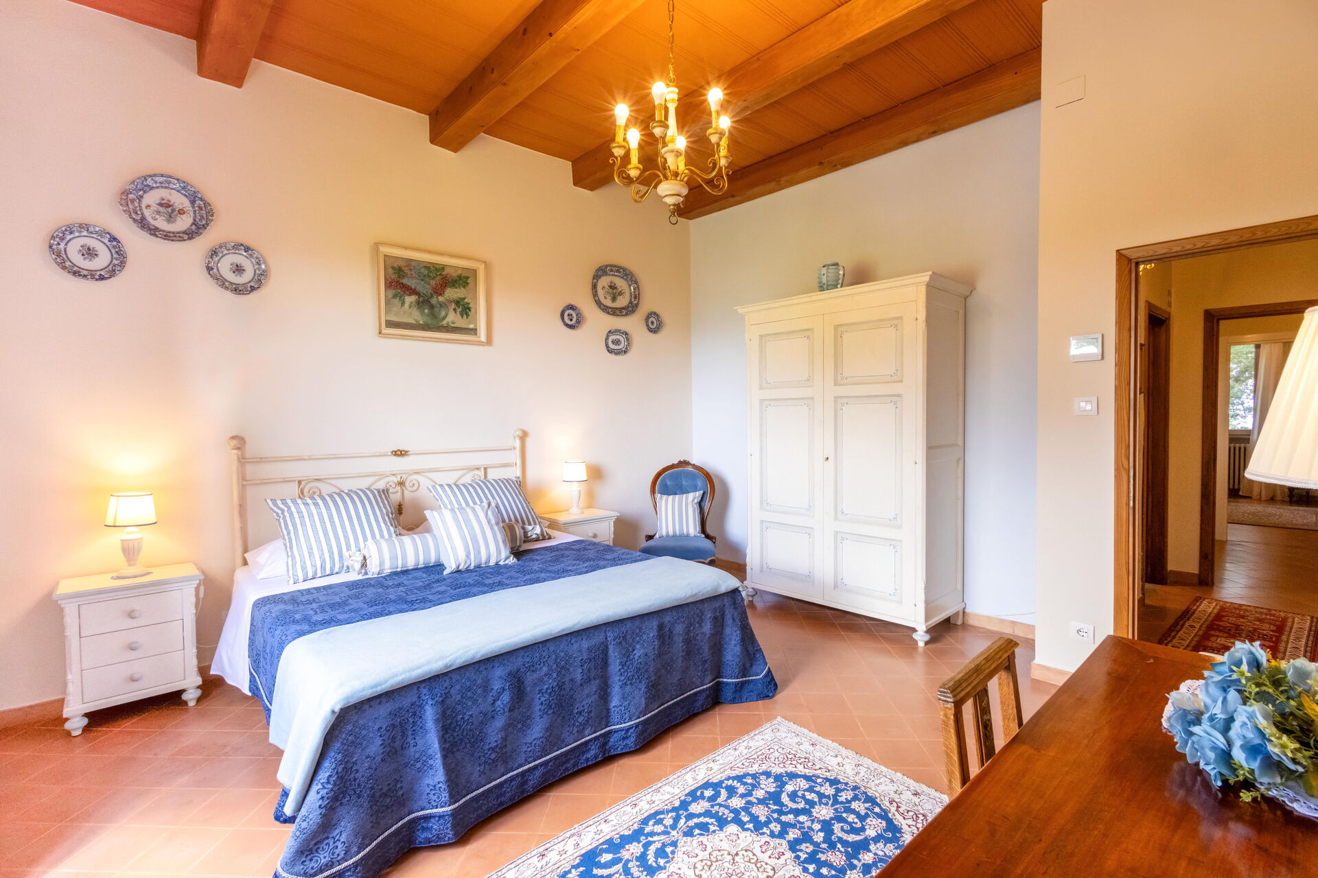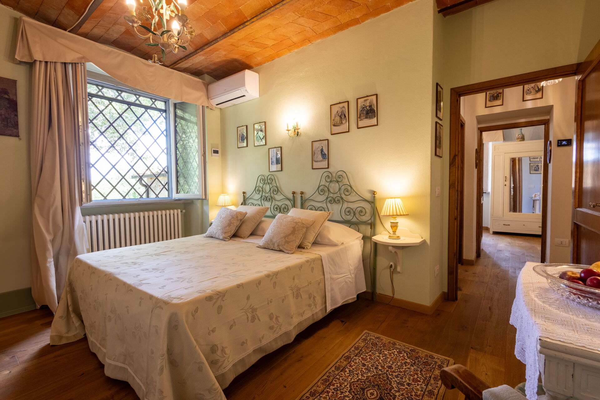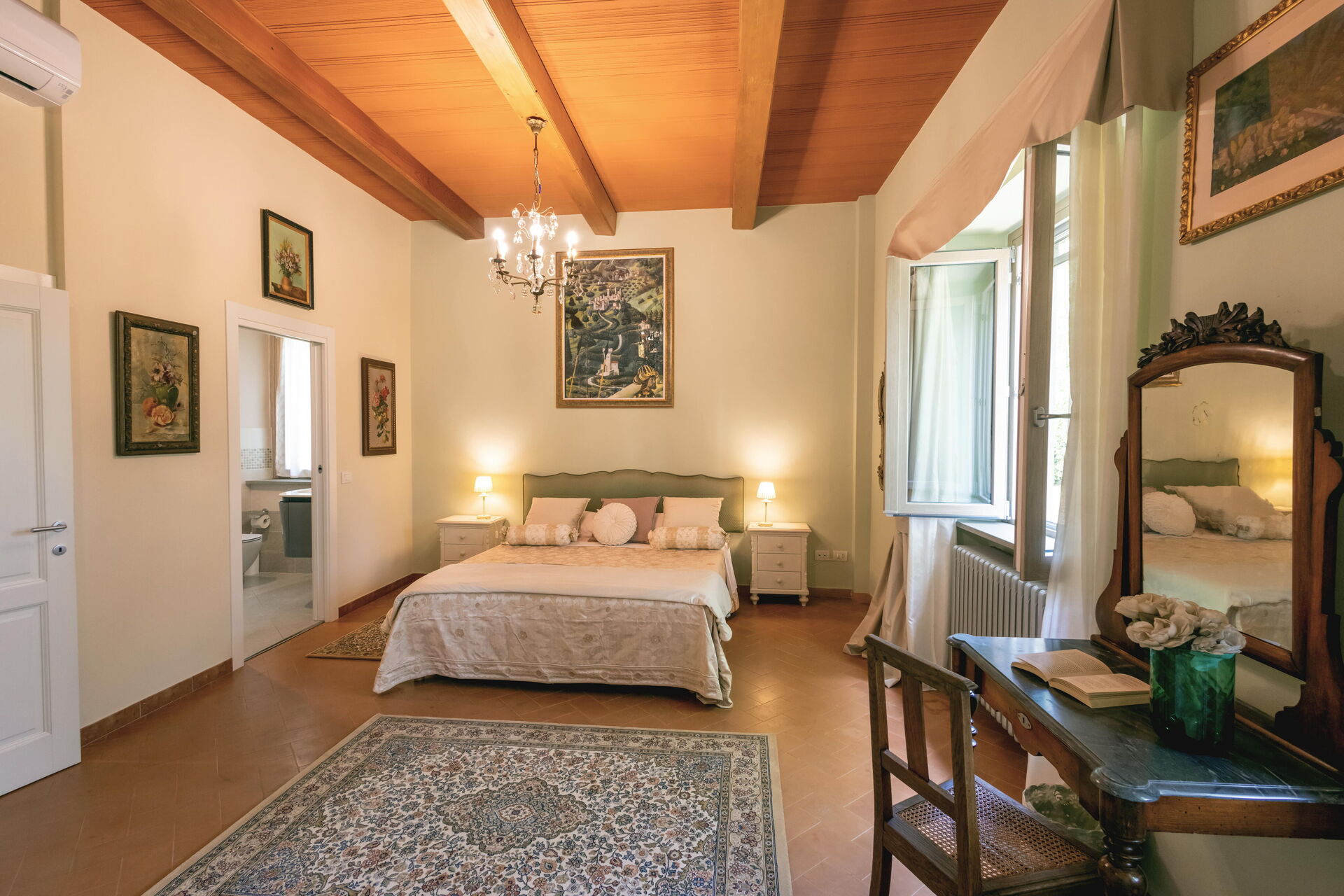 Bedroom + Ensuite Bathroom 1 (24 m2): king size bed (length: 2.1m, width: 1.7m), WIFI internet, air conditioning, mosquito net, two armchairs, working desk, basin, toilet, bidet, shower, hairdryer.