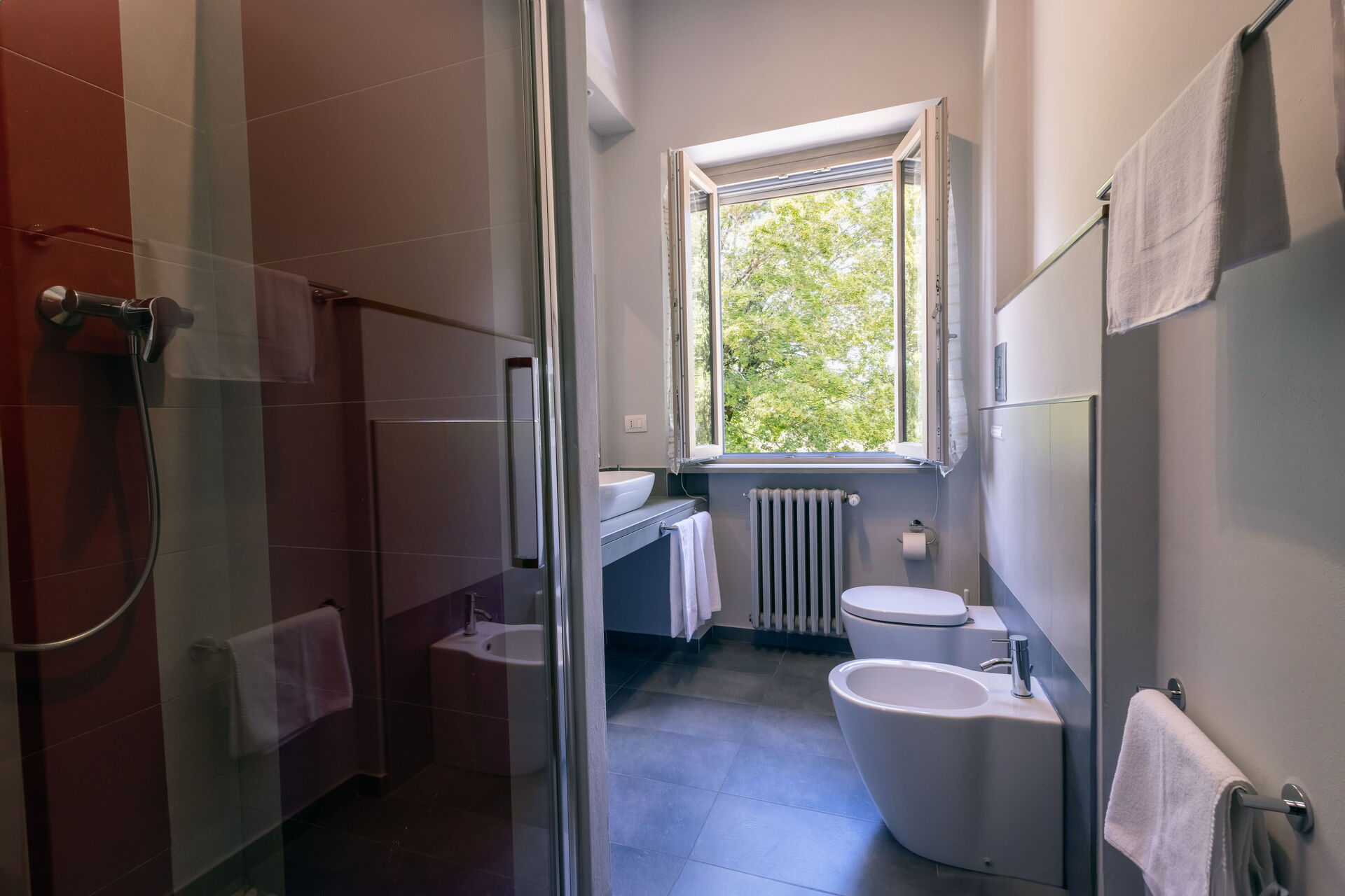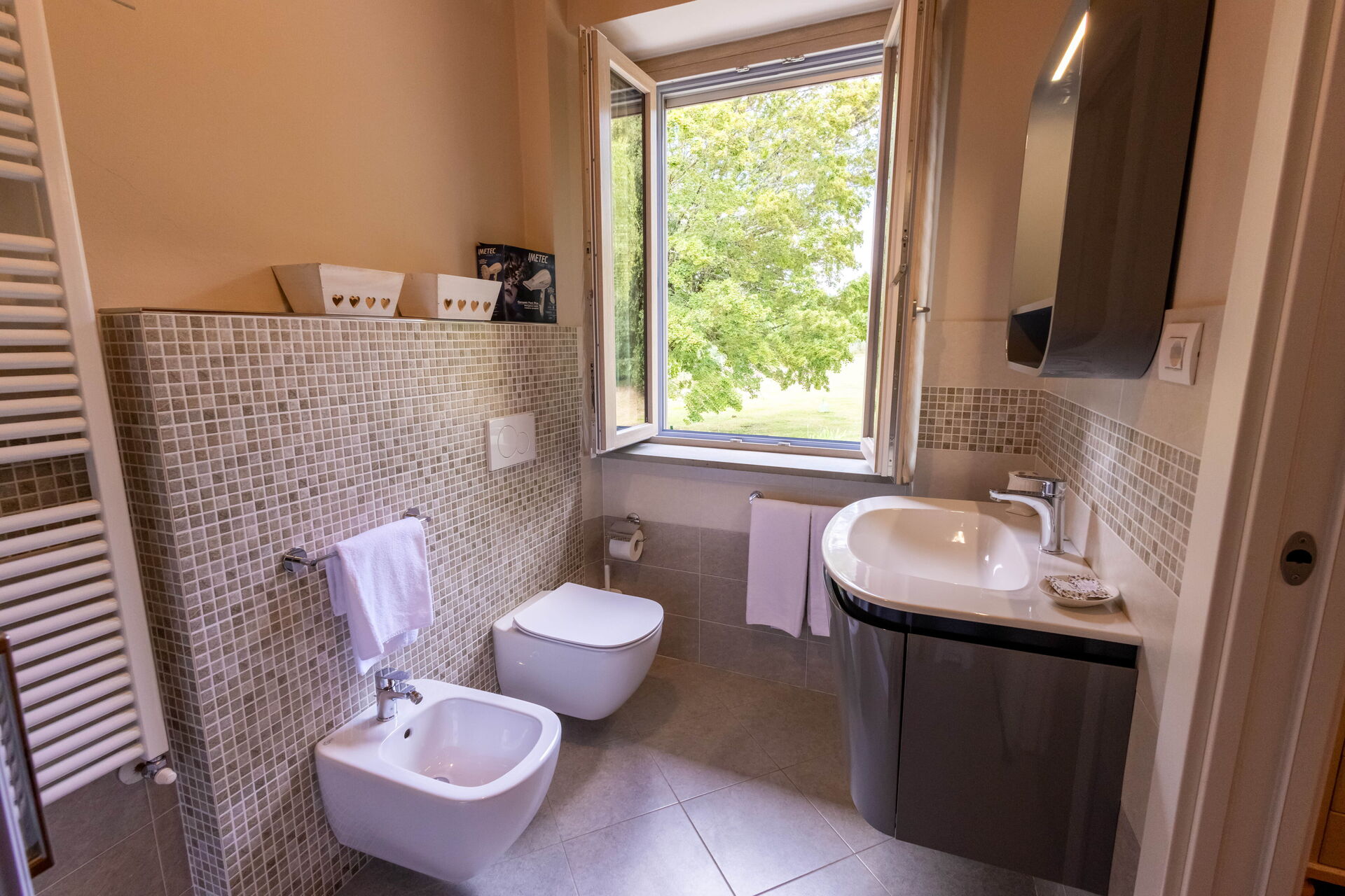 Bathroom: basin, toilet, bidet, shower, hairdryer.