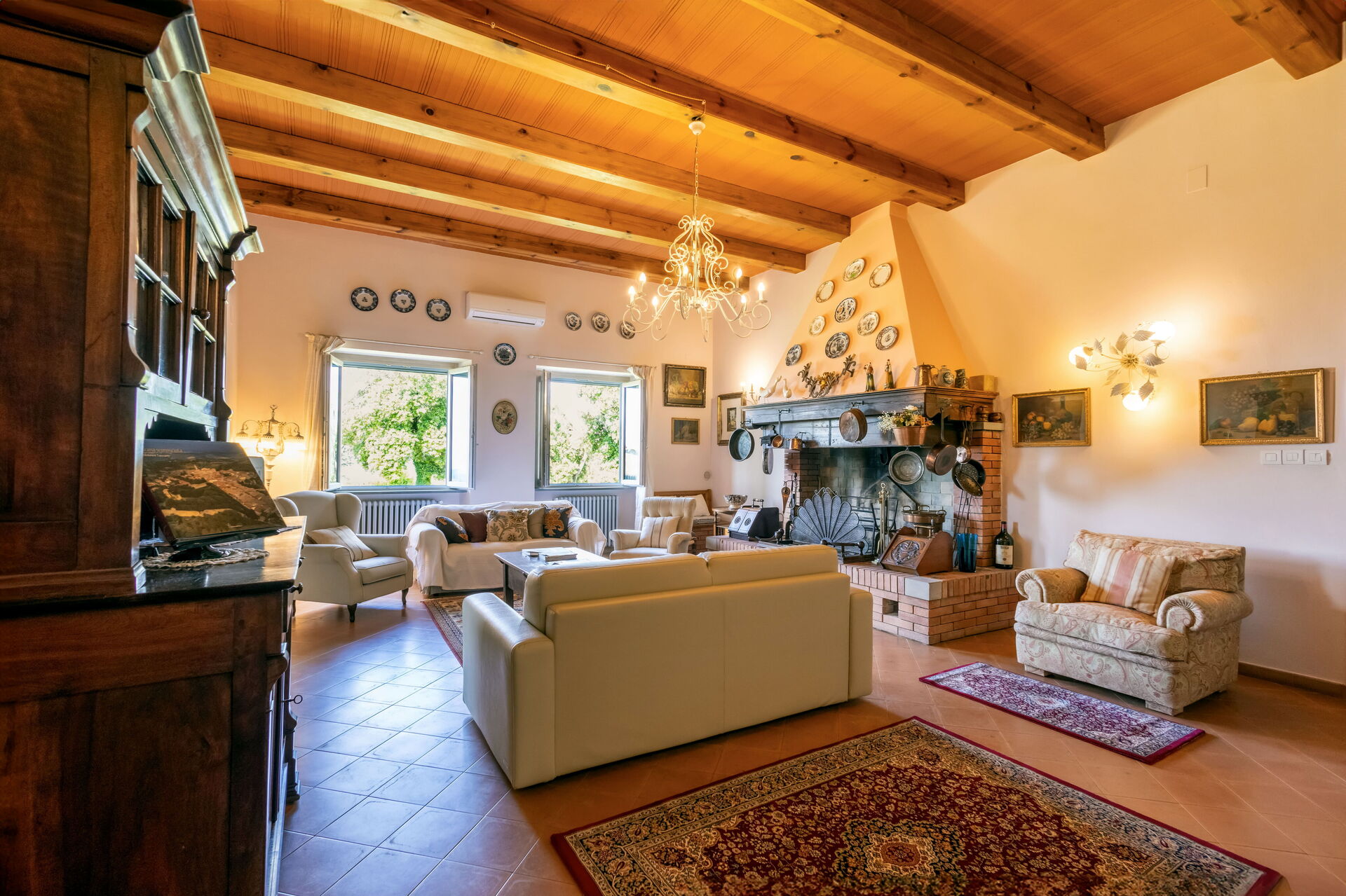 Living room (44 m2): three sofas (people: 12), three armchairs, fireplace, sofa bed double (length: 2m, width: 1.6m), three baby beds (length: 1m, width: 0.8m), three baby cribs, WIFI internet, air conditioning, satellite tv, television, mosquito net, smoke detector, co2 detector.