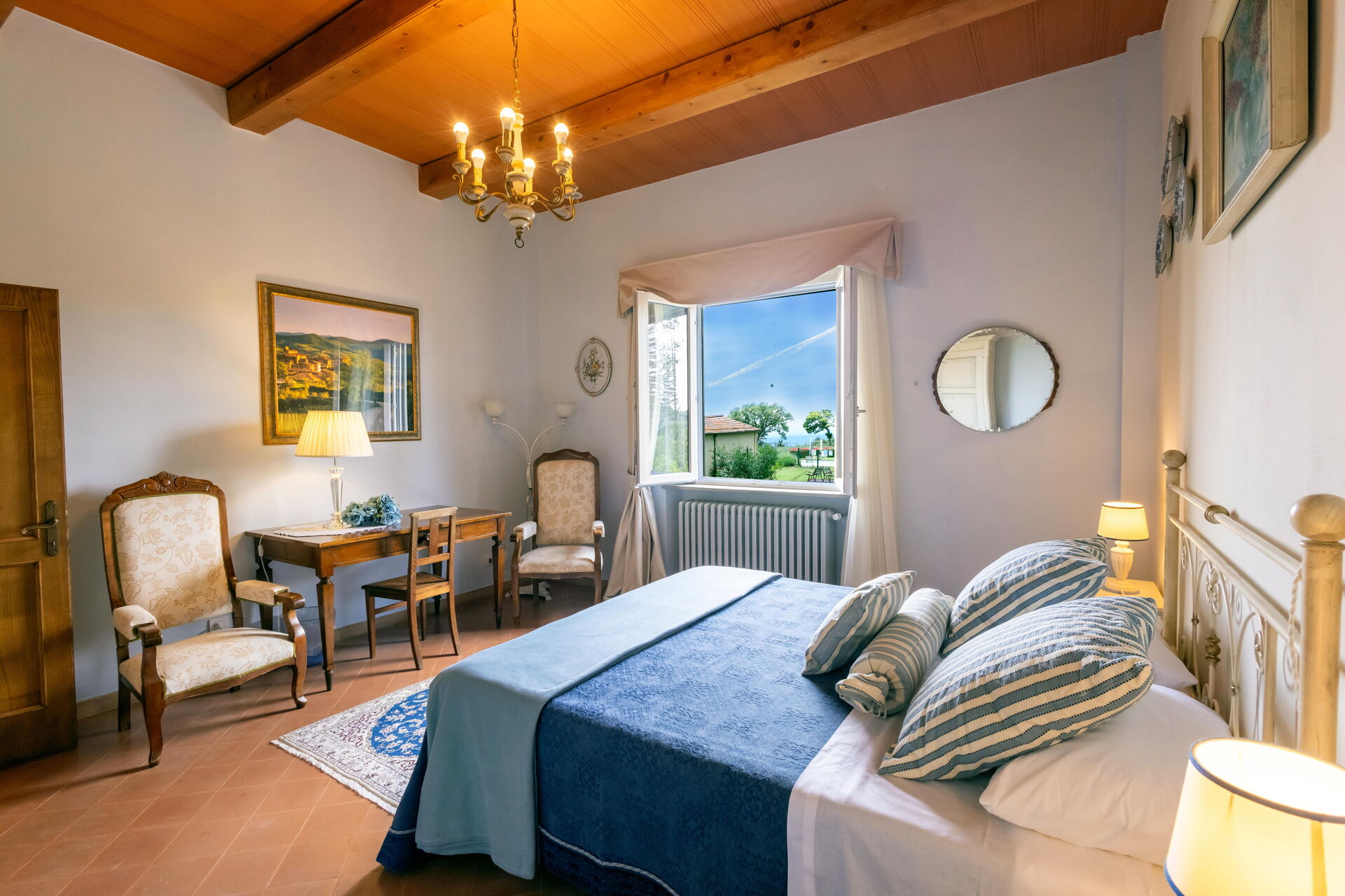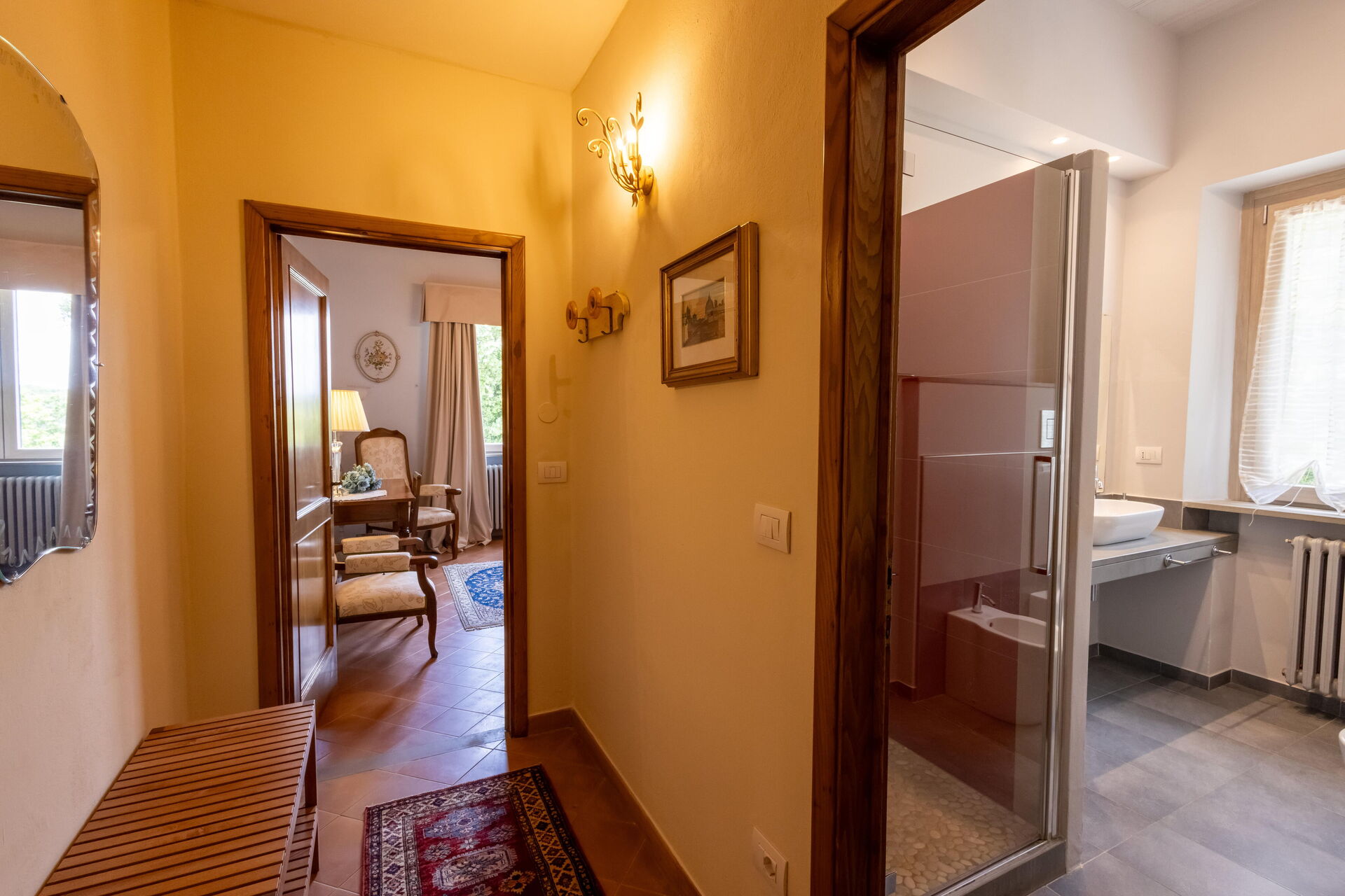 Bedroom + Ensuite Bathroom 2 (22 m2): double bed (length: 2m, width: 1.6m), WIFI internet, air conditioning, mosquito net, two armchairs, working desk, basin, toilet, bidet, shower, hairdryer.