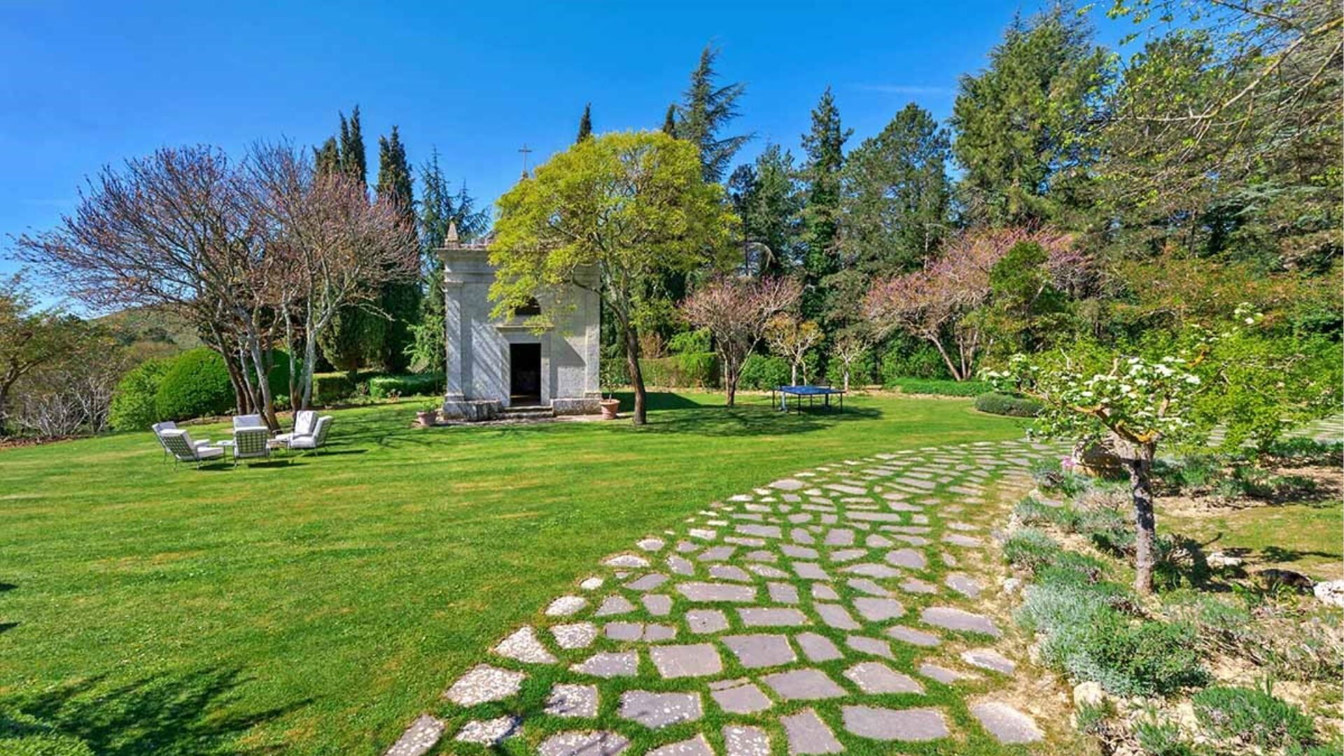 The outdoor areas of this remarkable property provide generous space for leisure and entertainment across beautifully maintained grounds. You will enjoy access to verdant green spaces surrounding the villa, complemented by your own private wood perfect for peaceful walks and natural exploration. The impressive non-heated swimming pool measuring 8x16 meters serves as the centerpiece of the outdoor entertainment area, available for your enjoyment from May 1st through October 31st. A charming pergola offers an inviting covered dining space where you can savor meals alfresco while taking in the scenic Tuscan landscape. Recreation enthusiasts will appreciate the dedicated soccer field, ideal for friendly matches and outdoor activities. The meticulously maintained gardens frame the entire property, creating a serene environment that captures the essence of Italian countryside living.