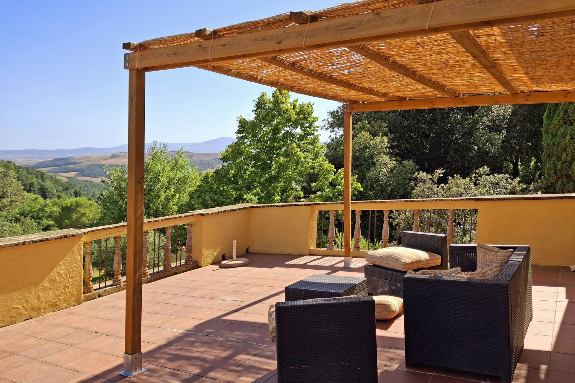 The villa occupies a privileged position in the Val d'Orcia countryside near Radicofani, placing you within the heart of one of Tuscany's most celebrated landscapes. This UNESCO World Heritage territory offers rolling hills, cypress-lined roads, and medieval hilltop towns that epitomize the classic Italian countryside. The historic Via Francigena pilgrimage route passes through the region, connecting you to centuries of cultural and spiritual heritage. The surrounding area provides numerous opportunities for exploring charming villages, renowned wineries, thermal springs, and authentic trattorias serving traditional Tuscan cuisine. The elevated hilltop location delivers commanding views across the valley, allowing you to appreciate the distinctive beauty of this legendary landscape from the comfort of the estate.