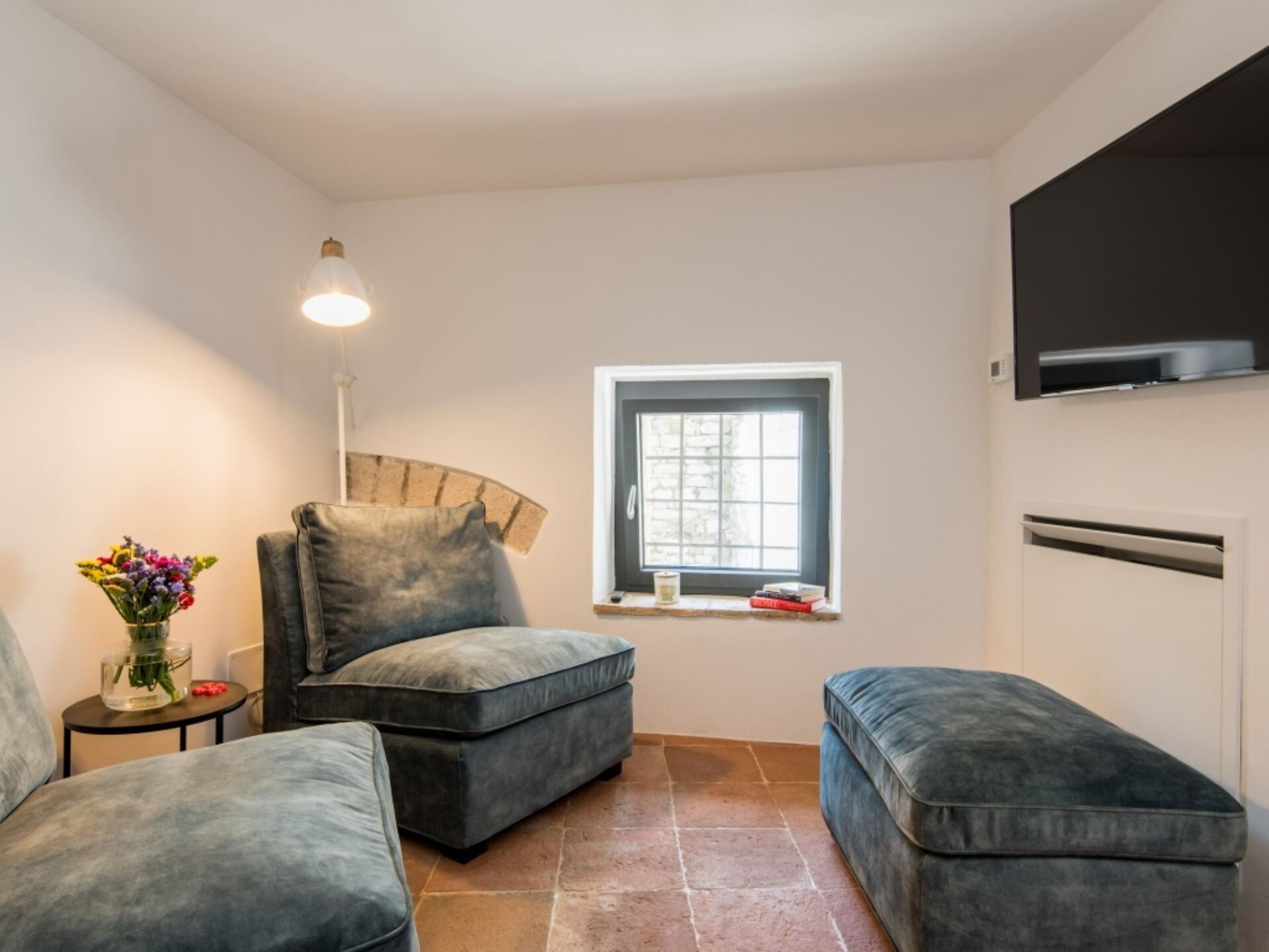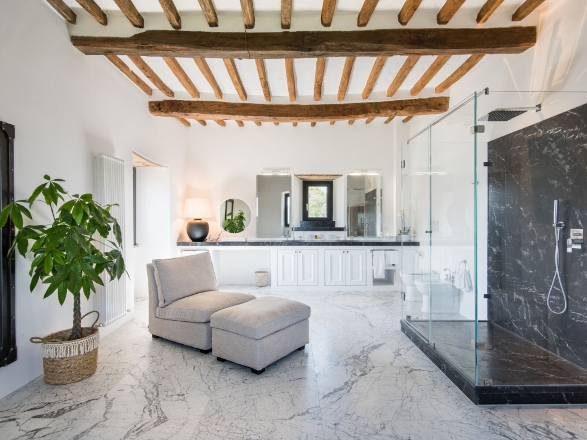 Villa Ugo accommodates a maximum capacity of 20 guests across its thoughtfully designed interior spaces, which are divided between the main historic residence and a separate annex building. The property offers a total of 10 bedrooms and 10 bathrooms, ensuring privacy and comfort for all occupants. The main villa houses 6 super king size bedrooms, each appointed with its own precious private marble bathroom, while the remaining 4 super king size bedrooms with private marble bathrooms are located in the annex structure on the opposite side of the garden. The main residence features expansive living areas that exude elegance without ostentation, achieved through the perfect blend of ancient architectural elements and modern comforts. Original terracotta floors flow throughout the spaces, while spectacular frescoes dating back to the 13th century adorn the walls, and travertine marble stairs connect the various levels of this historic castle. The dining room in the main villa is particularly noteworthy, embellished with ancient frescoes and directly connected to the meticulously restored medieval church of Santa Maria Maddalena, an 11th century structure that serves as an incomparable venue for weddings and special events. The main villa includes a well-equipped kitchen fitted with modern appliances to meet all your culinary needs. The annex building mirrors this functionality with its own spacious kitchen and an elegant living room that opens onto the panoramic terrace. Both buildings feature rooms designed for spacious and welcoming gatherings, with generous proportions that allow your group to spread out comfortably. A dedicated laundry room complete with washing machine, dryer, iron and ironing board ensures practical convenience during your stay.
