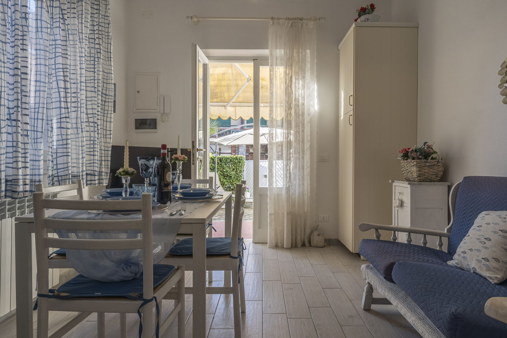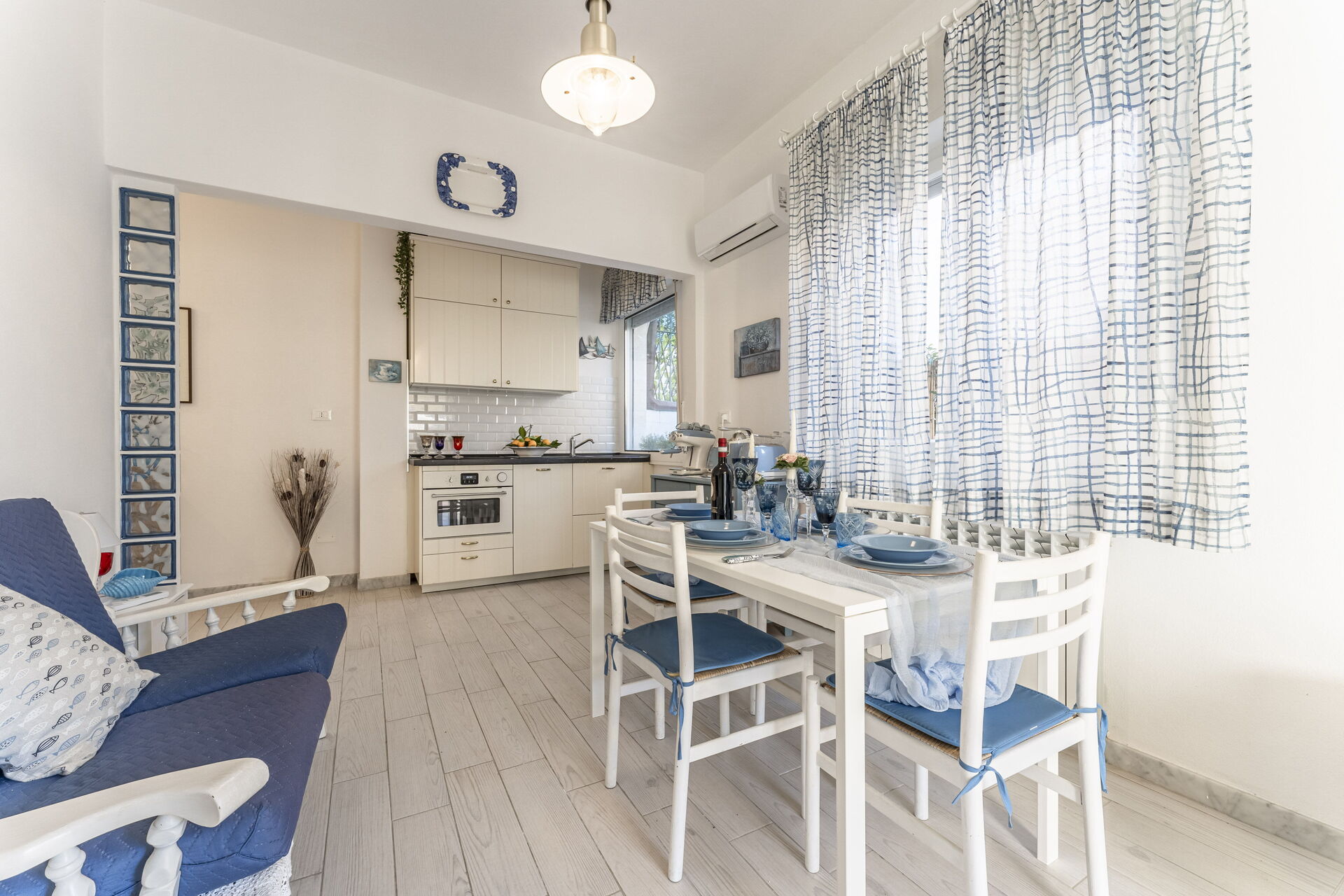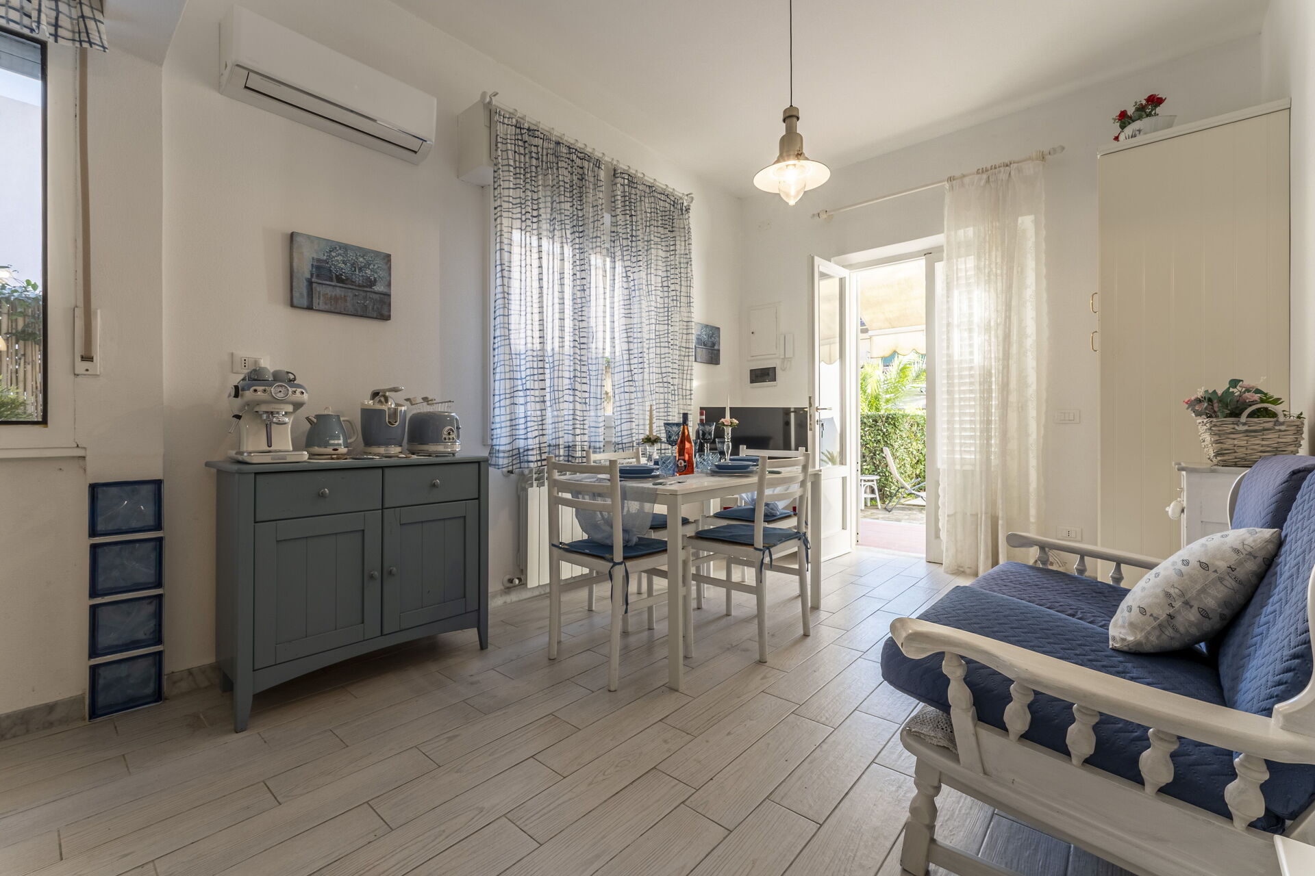 Kitchen + living room: well equipped kitchen, dining table, dishwasher, fridge, freezer, stove top, oven, italian coffee machine, sofa, WIFI internet, air conditioning, television.