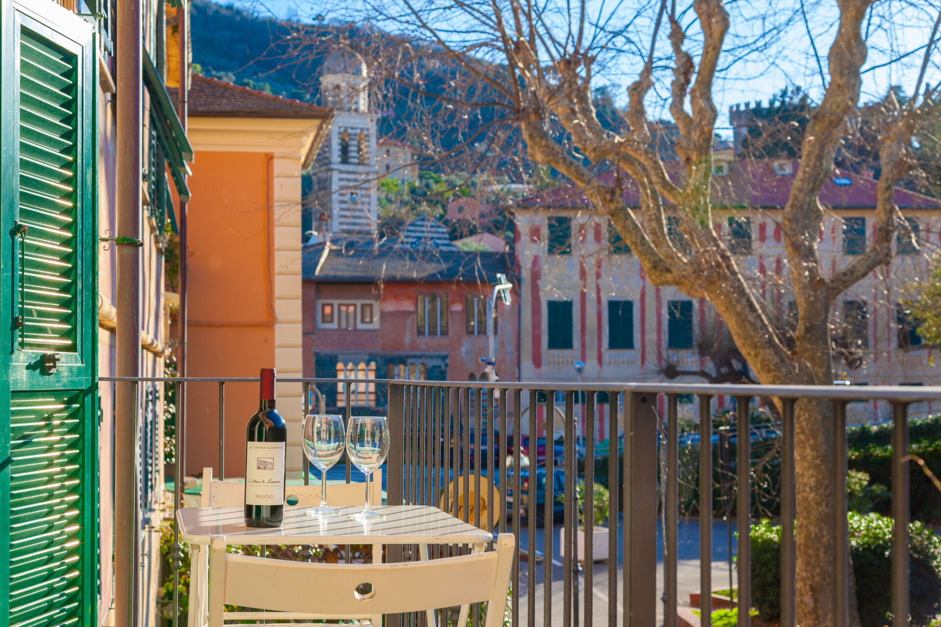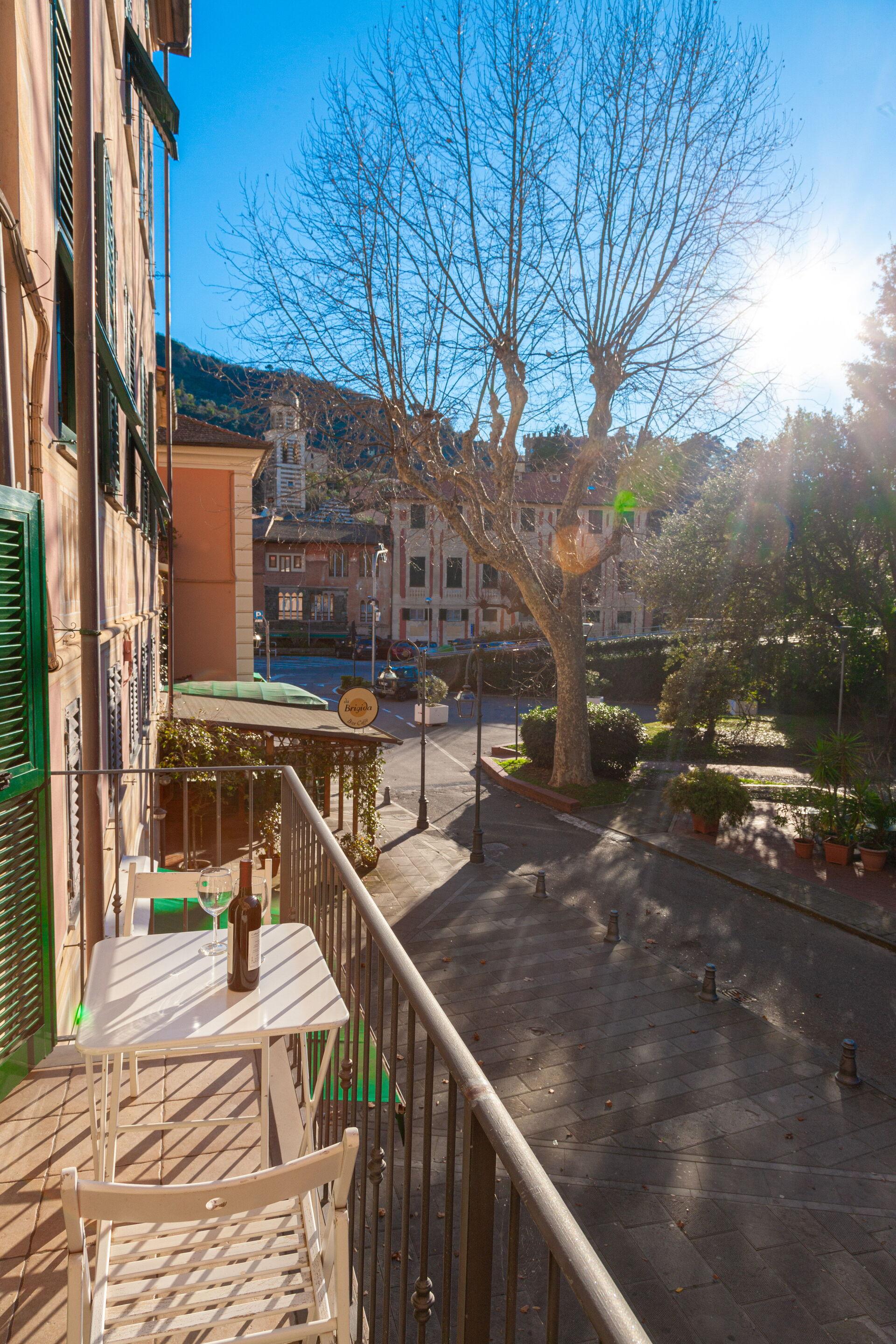 The balcony, equipped with a table and chairs, overlooks the green park of Levanto (piazza Staglieno).