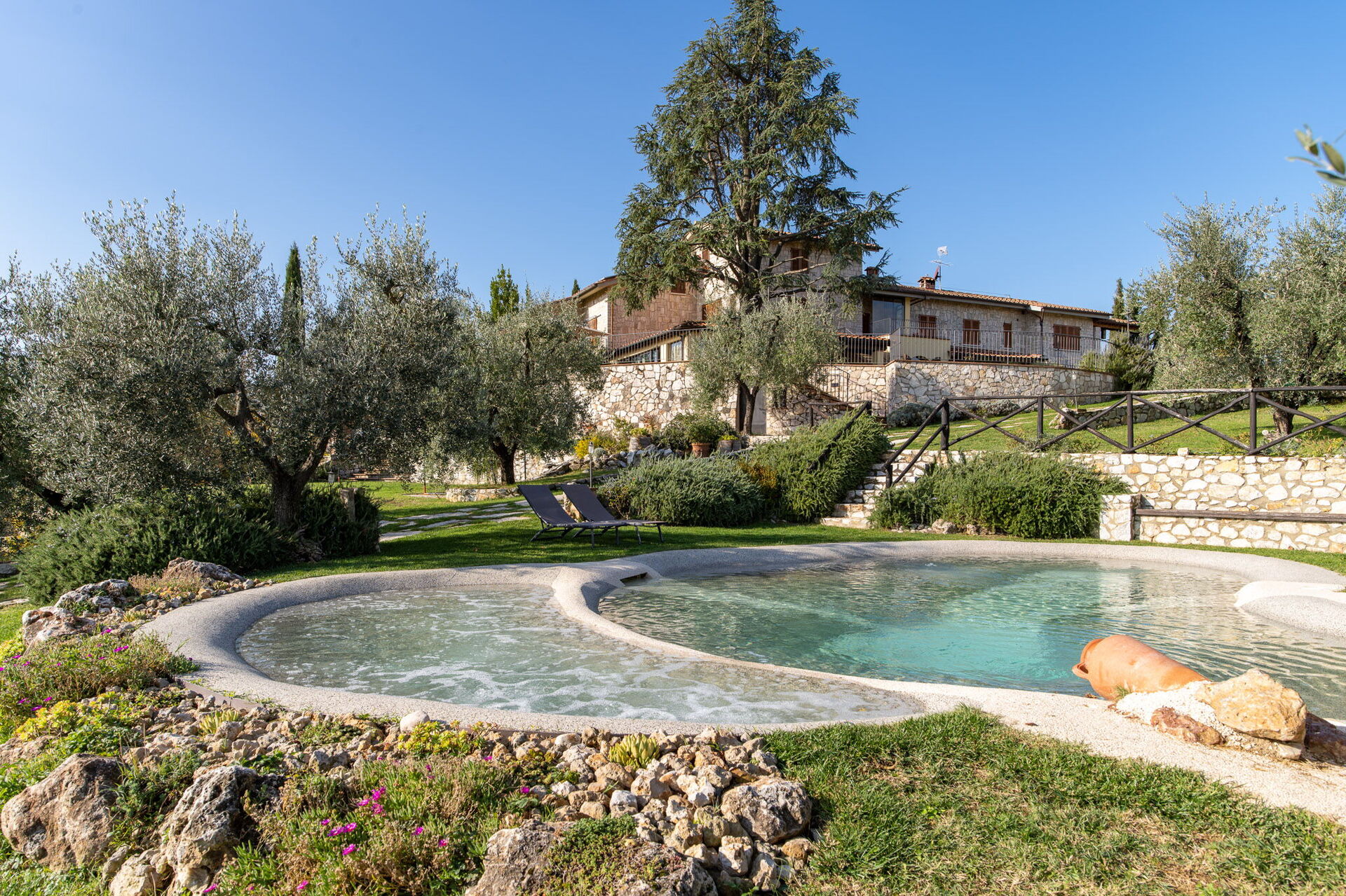 Garden (2500 m2): swimming pool (private, outdoor), WIFI internet, barbecue, fireplace, al fresco dining, dining table (people: 14), garden furniture, terrace furniture, sunbed.