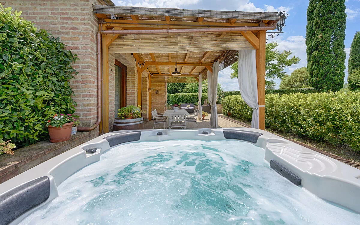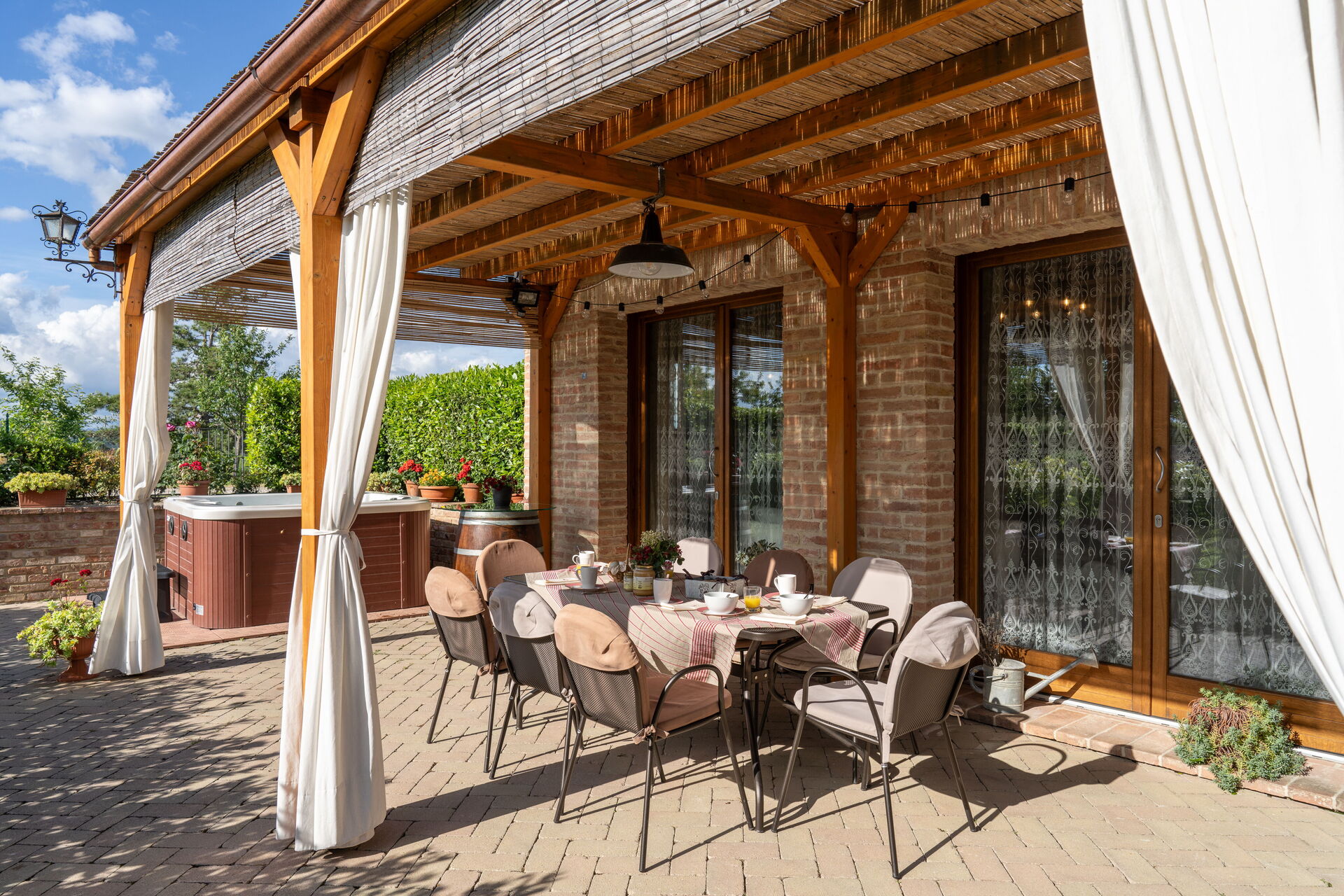 Veranda: outdoor hot tub, al fresco dining, dining table (people: 8), WIFI internet, barbecue, garden furniture, terrace furniture.