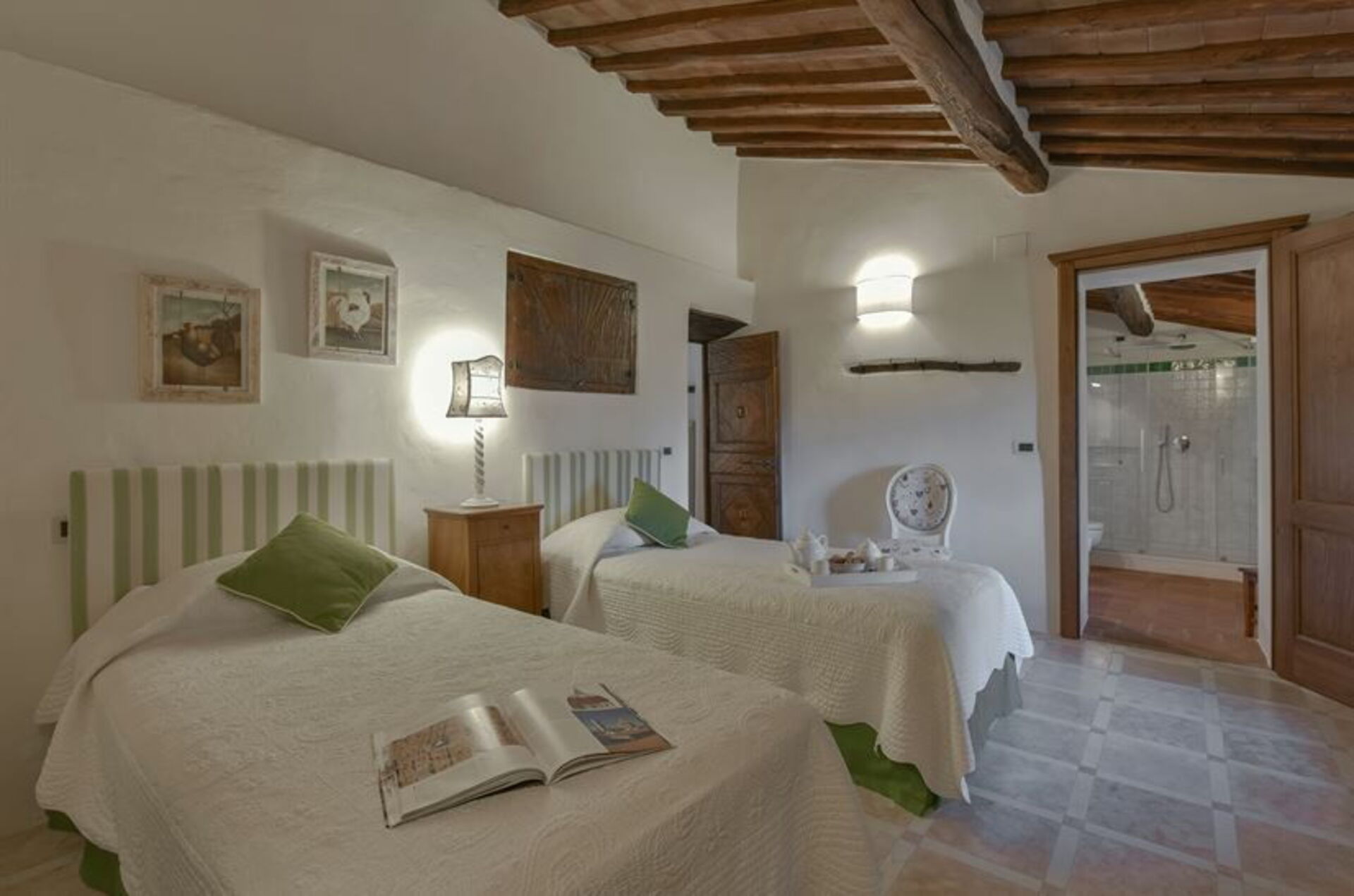 Bedroom + Ensuite Bathroom 2: two single beds (length: 1.9m, width: 100m), WIFI internet, air conditioning, mosquito net, satellite tv, fireplace, basin, toilet, bidet, shower, hairdryer.