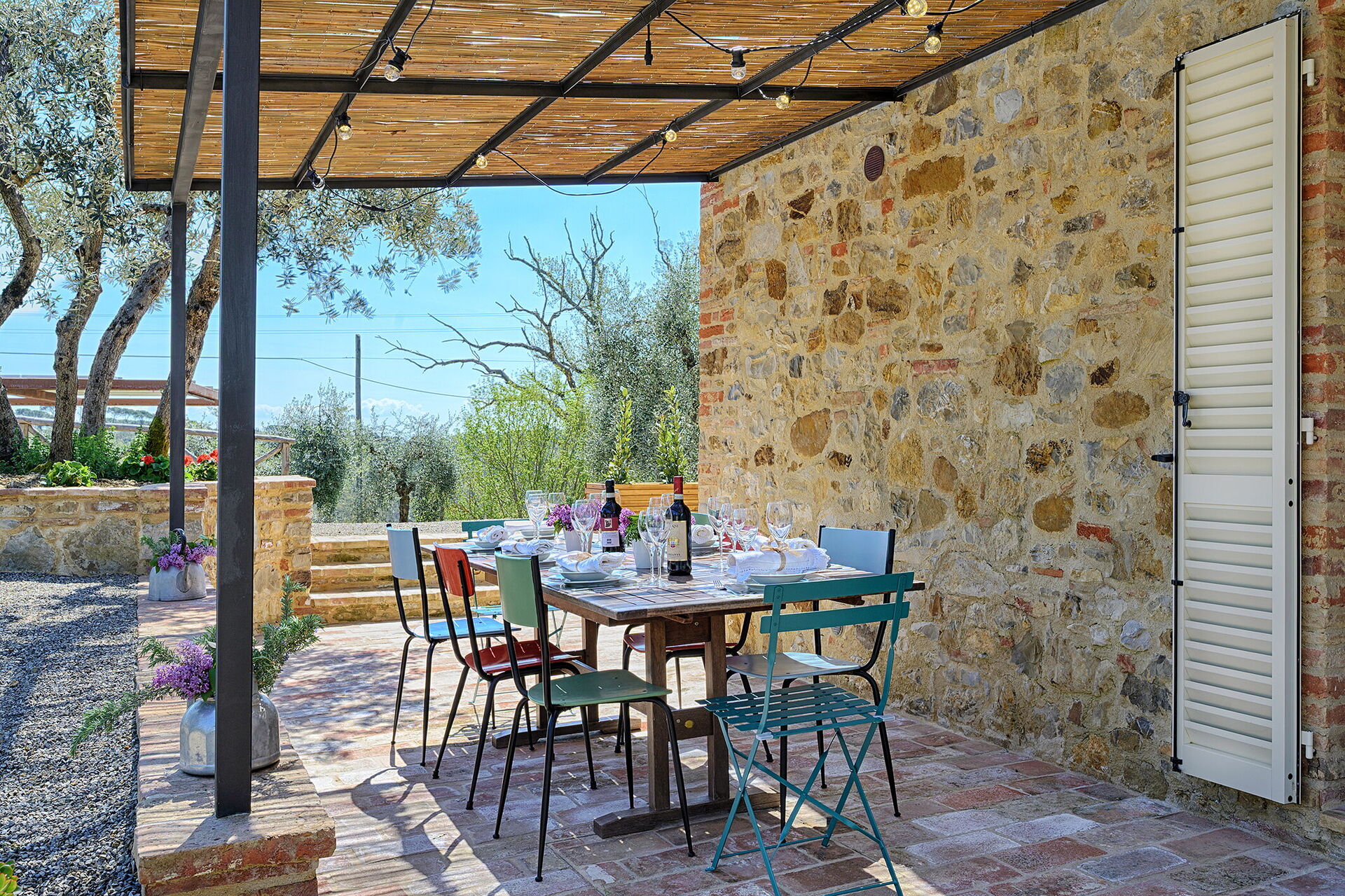 Upon arrival you will be greeted by the owner or manager where you’ll find a beautiful clean well-maintained property with views of the hills ideal for a peaceful vacation in Tuscany. For your pleasure you will find a private garden where you can relax while enjoying a nice cold beverage after a busy day of sightseeing. A real benefit of renting a home, instead of multiple hotel rooms, is the ability to relax after a busy day of sightseeing with family and friends. Enjoy a meal together along with some local wine to finish the day. Also available outdoors are a barbecue grill, patio and hot tub. Dining with friends and family is a big part of the Tuscan culture. Take advantage of the well-equipped kitchen to prepare meals using local produce while on your holiday. The kitchen includes coffee machine, microwave, toaster, stove and refrigerator, as well as, plenty of tableware and cutlery for up to eight people. Dine 'al fresco' like a real Tuscan, the fully furnished veranda is the perfect setting to enjoy food, family and the nice Tuscan weather.