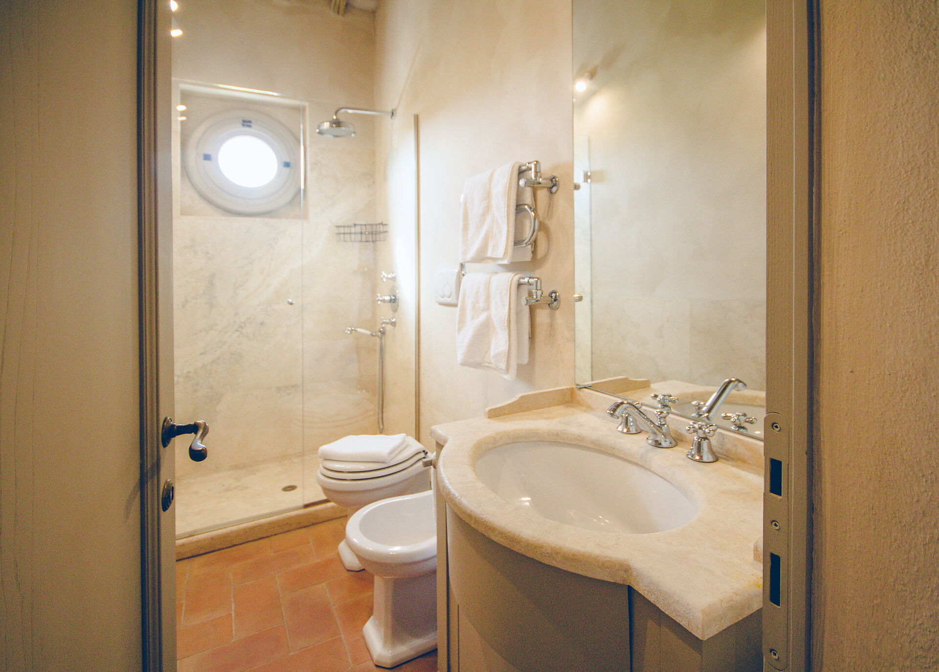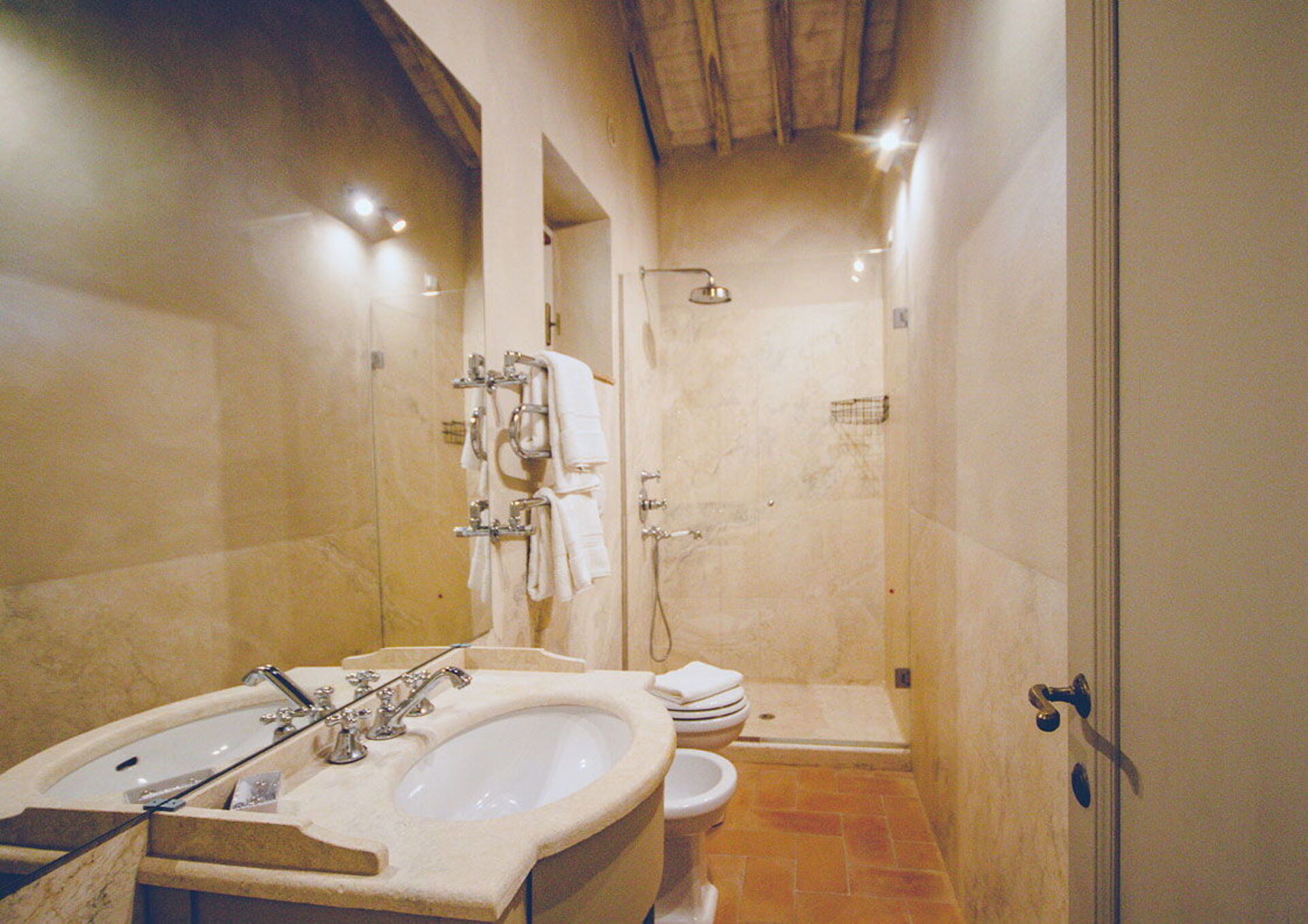 Bathroom: double basin, toilet, bidet, shower, hairdryer.
