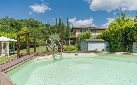 The property "Il Casale" is a modern, beautiful single-family house surrounded by meadows near Camaiore, Italy. It offers a private garden of 1'500 m2 with a lawn, an above-ground swimming pool (6 x 3 m, depth 100 cm, available seasonally from May 1st to October 4th), an outdoor shower, a patio, garden furniture, a barbecue area, and parking for up to 5 cars on the premises. The house is equipped with Internet Wifi, making it an ideal vacation rental for families or groups seeking a relaxing getaway in the Italian countryside.