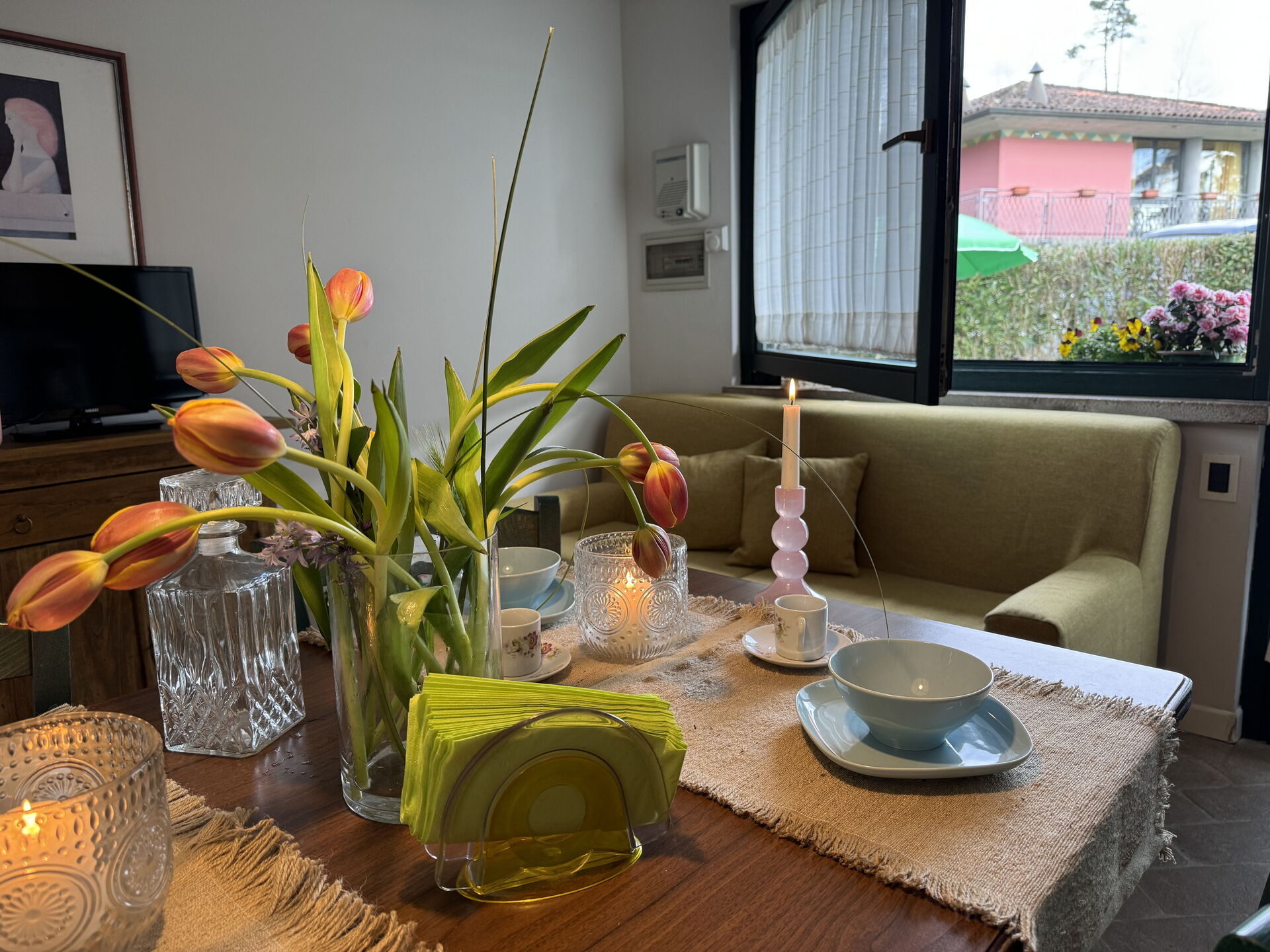 Kitchen + living room: dining table (people: 4), fridge, freezer, stove top, oven, american coffee machine, sofa (people: 2), WIFI internet, mosquito net, highchair, satellite tv, smoke detector, co2 detector, exit to the garden.