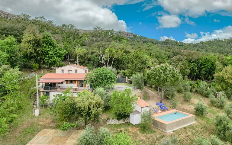The property is a 5-room house spanning 150 square meters across two levels, featuring a spacious and rustic decor. The living/dining room has an open-hearth fireplace, a TV, and air conditioning, with an exit leading to the terrace. One double bedroom is equipped with air conditioning and has access to the terrace. Another room has a french bed measuring 120 cm. There is also a double bedroom without a window. The open kitchen includes an oven, dishwasher, four gas rings, an electric coffee machine, and a wood-burning stove, with an exit leading to the terrace. On the upper floor, you'll find a double bedroom with air conditioning and a walk-through room with a double bed and air conditioning. The property boasts two showers, two bidets, and two toilets.