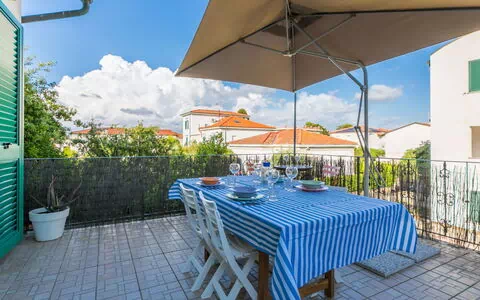 Located on the upper floor, this 4-room apartment offers a comfortable and tastefully furnished living/dining room with access to a terrace. It features one double bedroom, another double bedroom, and a room with one set of bunk beds that can accommodate two people. The open kitchen is well-equipped with a dishwasher, four gas rings, a toaster, a kettle, and an electric coffee machine.