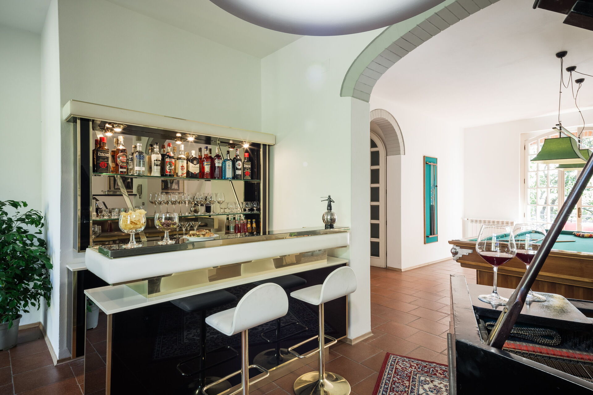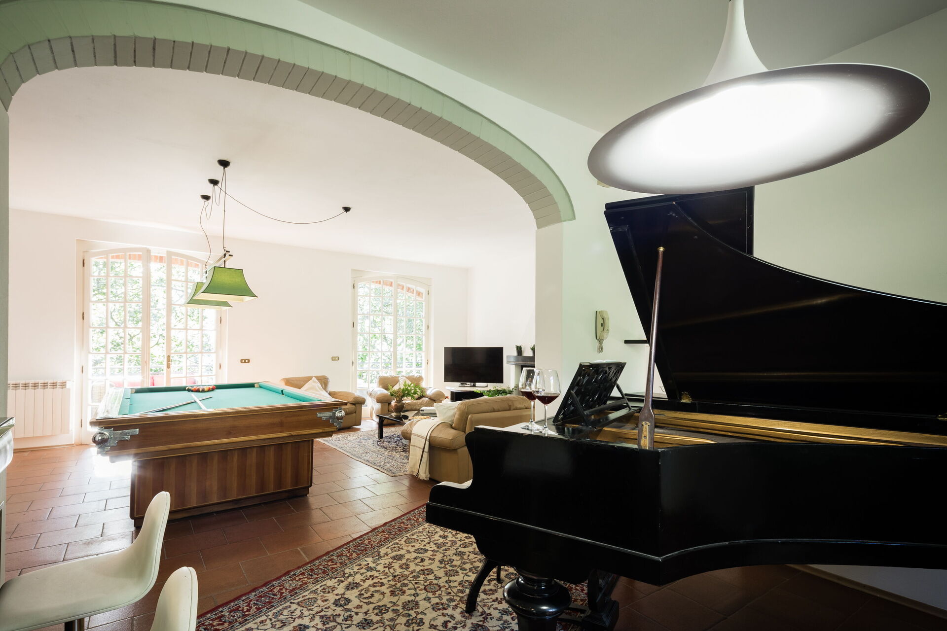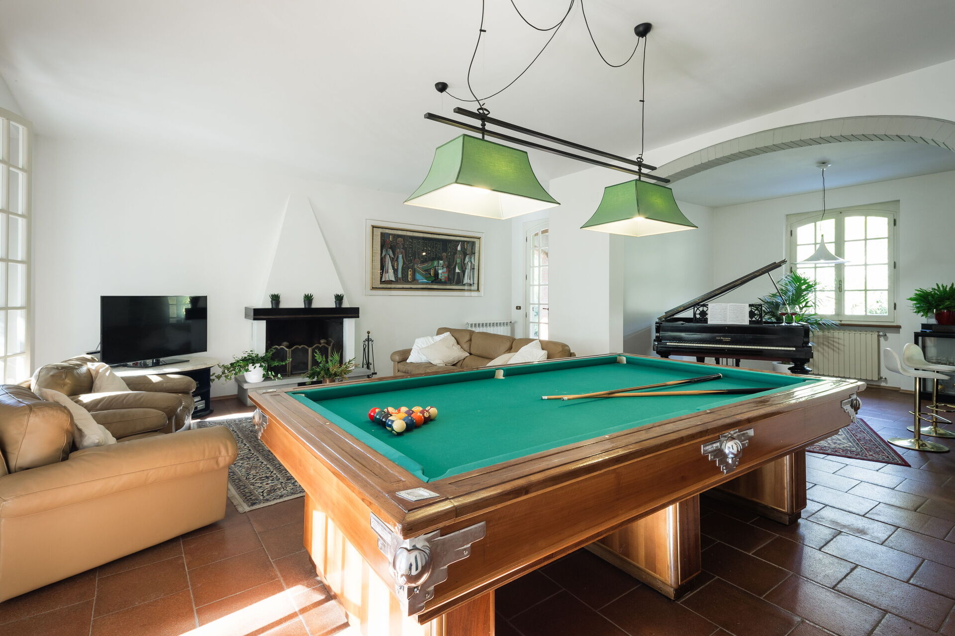 Large sitting room with TV (streaming tv), pool table, piano and piano bar - access to the pool area with changing room, outdoor shower and piano bar.