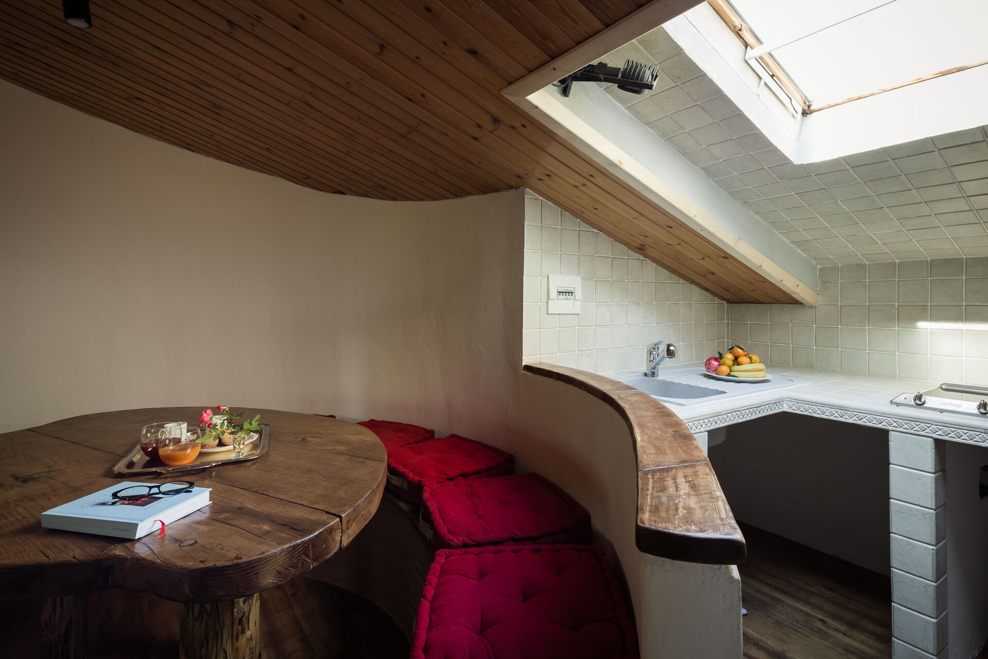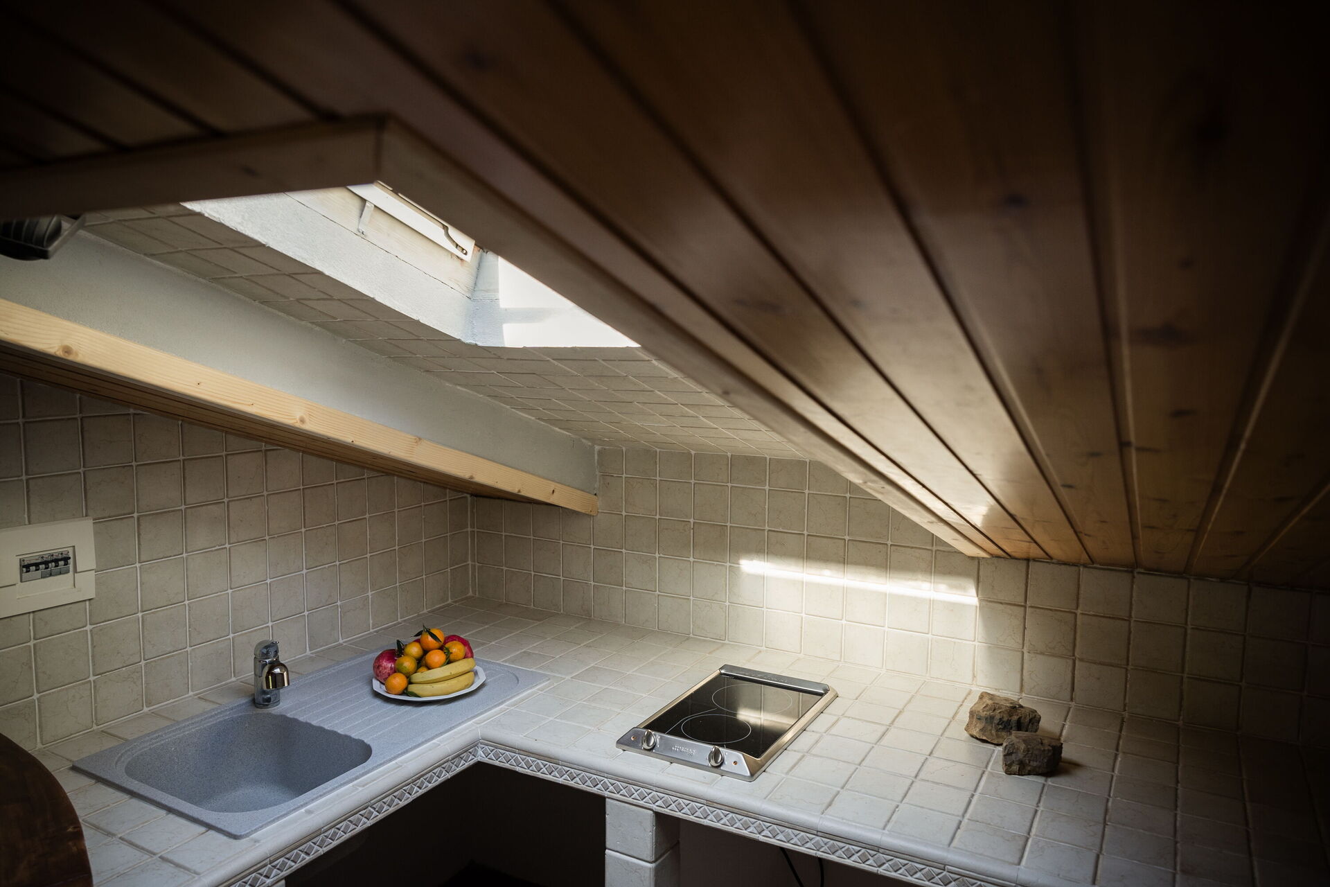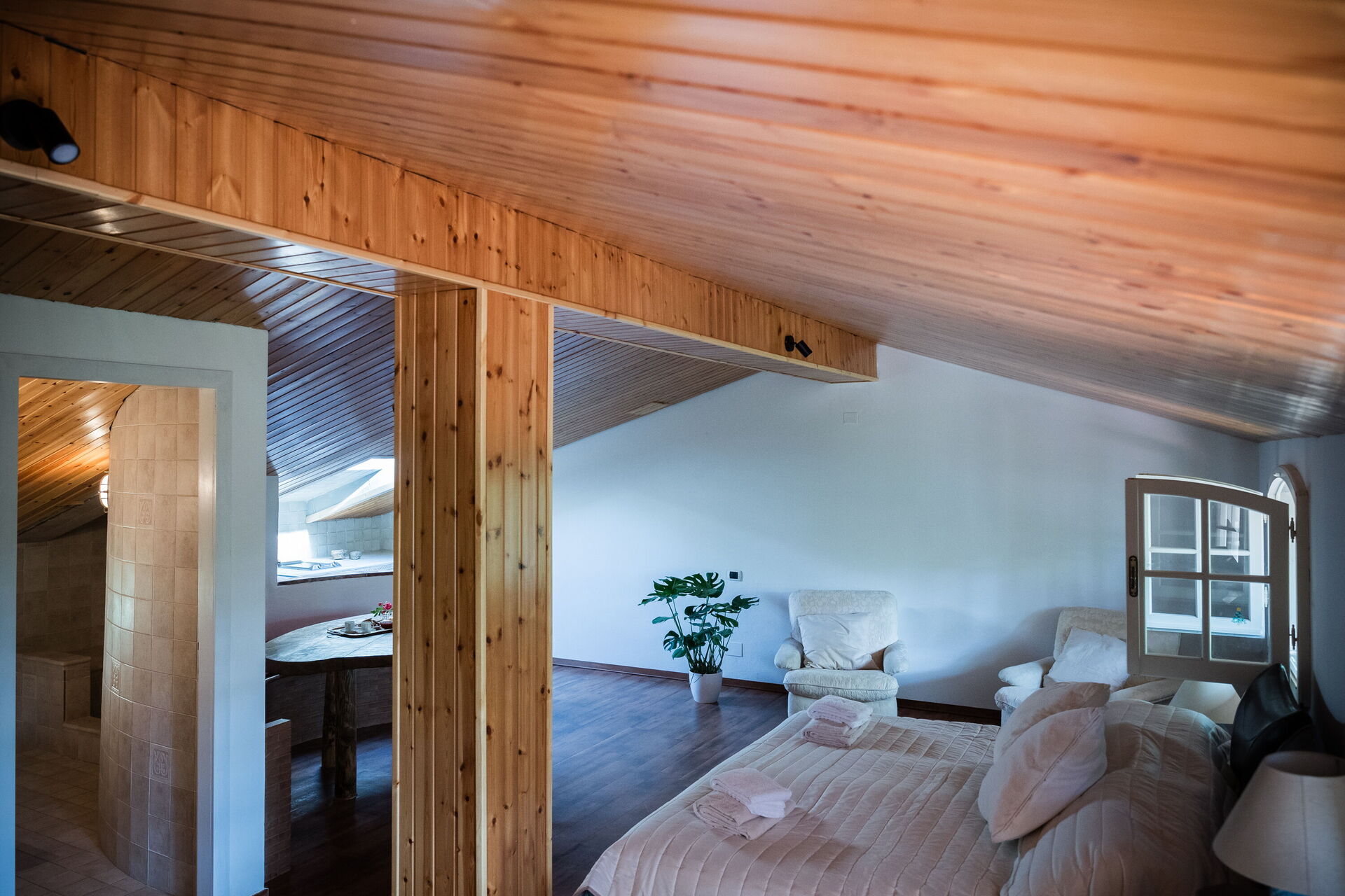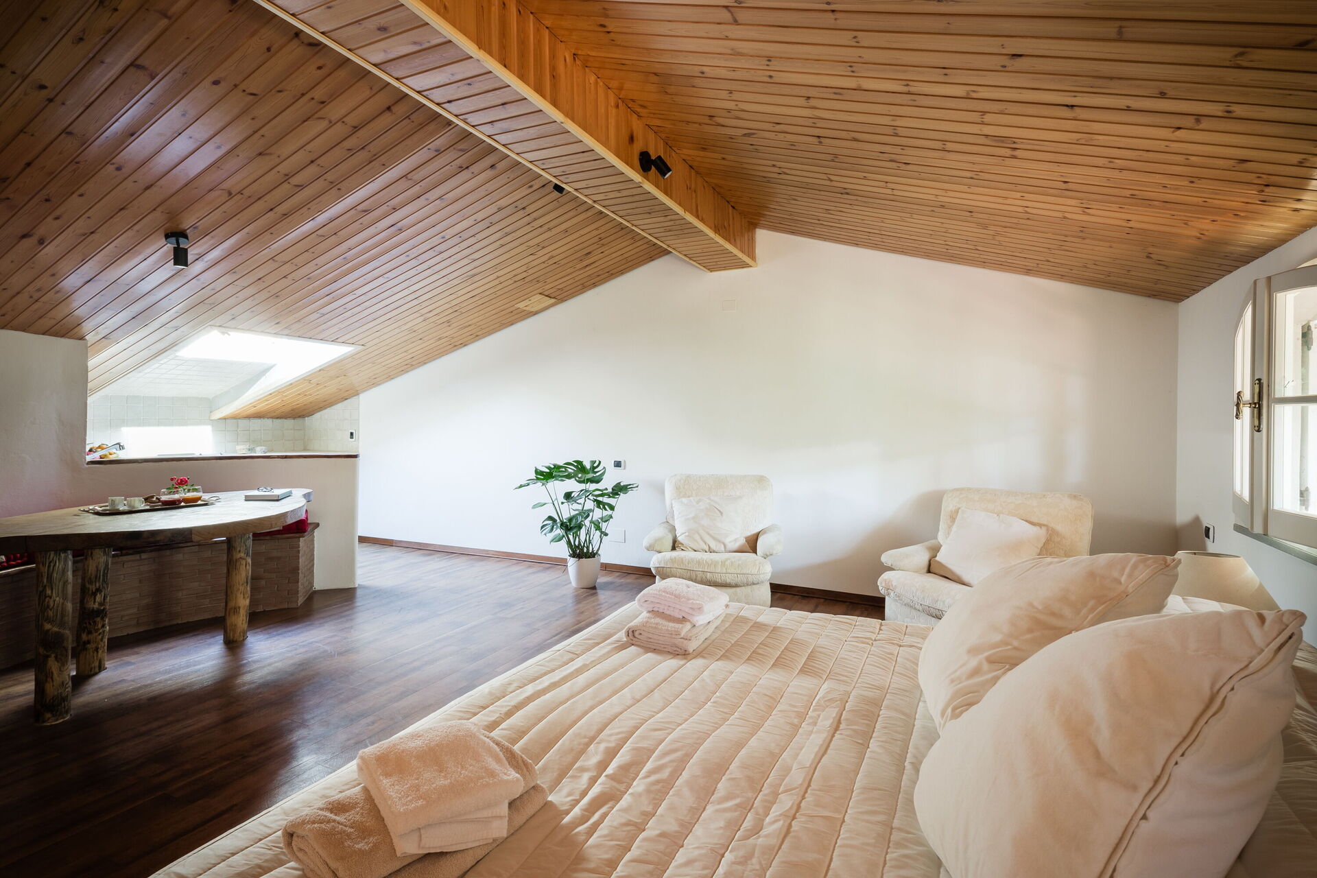 Attic with double bed and bathroom, little kitchen corner and sitting area.