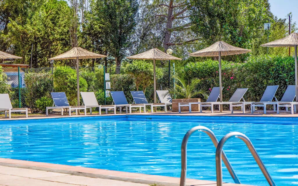 The resort is set within a natural landscape adorned with trees, offering a peaceful environment. An outdoor shower facility complements the swimming amenities. The property maintains its natural state, preserving the authentic charm of the Tuscan countryside near Capalbio, Italy.