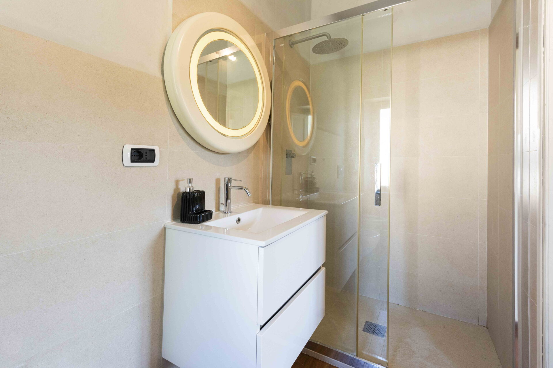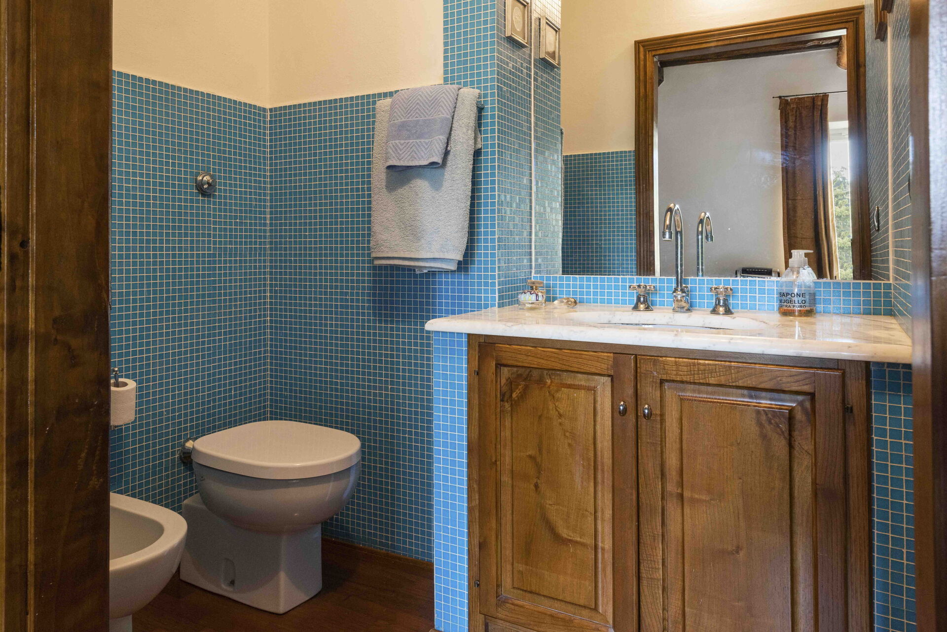 Bathroom 1: basin, toilet, bidet, shower.